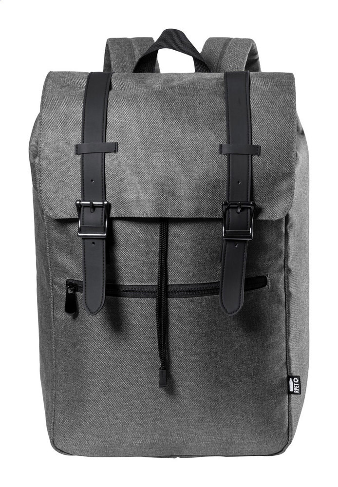 RPET-rugzak met gewatteerd laptop (15") en tablet (12") compartiment, voorvak met ritssluiting, gewatteerde achterkant en schouderbanden. Hoofdvak met trekkoord en magnetische drukknoopsluiting. 300D RPET-polyester. Met onderscheidend RPET-label.