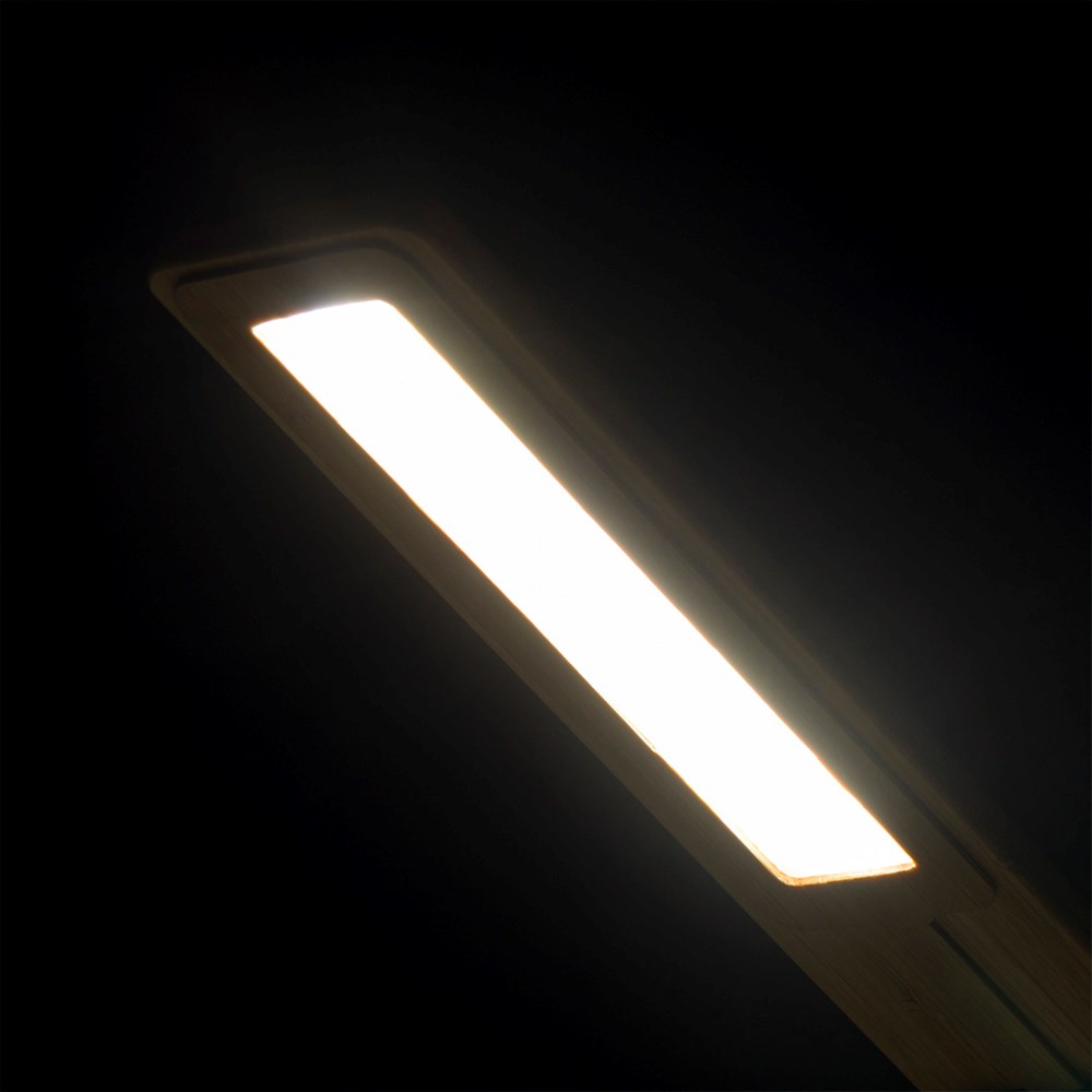 Natuurlijn, opvouwbare lamp en oplader. Gemaakt van bamboe van natuurlijke stekken en met anti-slip basis. Met geïntegreerde 10W draadloze oplader, inclusief 25 LED's met 3 verlichtingsstanden (warm, koud en medium) en instelbare intensiteit. 1H en 2H lichttimer, met USB uitgang. Compatibel met draadloos opladen van mobiele apparaten, inclusief type C oplaadkabel en gepresenteerd in een aantrekkelijke eco-designed doos. Gebruiksaanwijzing beschikbaar in het Engels en Spaans.