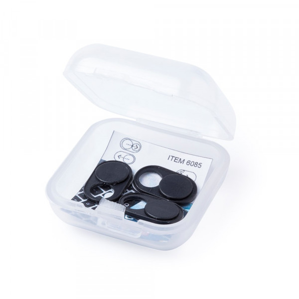 Cover om privacy te waarborgen. Deze plastic plaatjes kunnen voor een laptop, telefoon camera worden geplaatst, zodat mensen niet ongevraagd kunnen meekijken. Beschikbaar in wit en zwart. Gepresenteerd in een tas met inlegkaart.