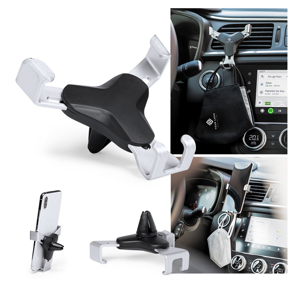 Smartphonehouder met een minimalistisch design en speciaal ontworpen voor XXL-formaat smartphones. Met universeel bevestigingssysteem, geactiveerd door het gewicht van de telefoon zelf, waarbij de zijgrepen worden aangepast zodra het apparaat in de houder wordt geplaatst. Voor auto-ventilatierooster en met een speciaal voor tampondruk ontworpen voorkant.