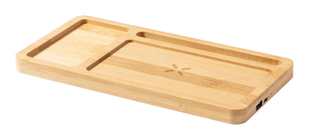 Bamboe bureau-organizer en mobiele telefoonhouder met ingebouwde draadloze snellader (15W). Met USB-oplaadpoort voor het gelijktijdig opladen van 2 apparaten (1 draadloos en 1 via kabel). Maximaal uitgang: 2000 mA. Inclusief USB-oplaadkabel.