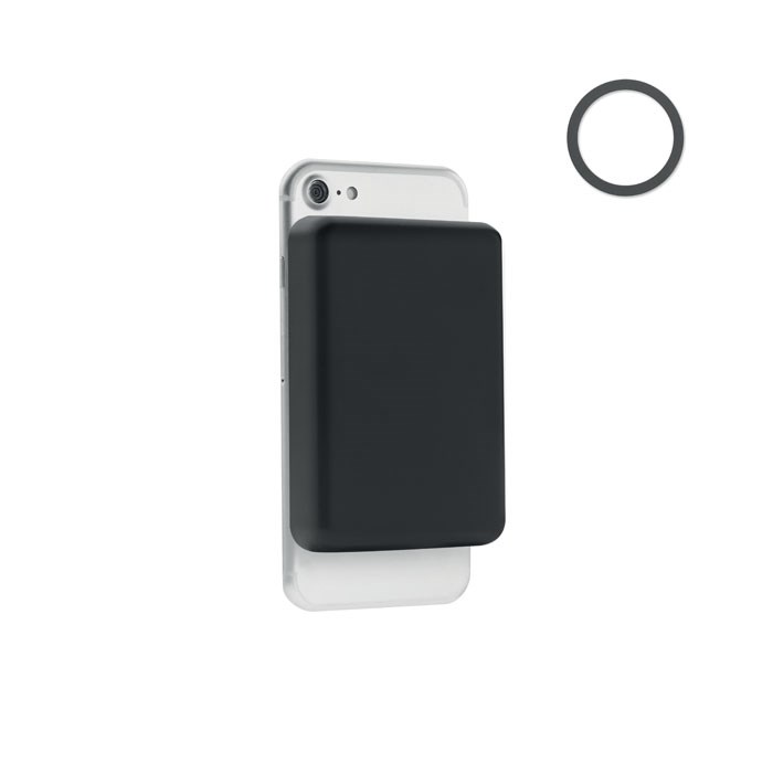 Magnetische draadloze lader (15W) en power Bank (5000 mAh). Output: DC DC 9V/2,22A (20 W) ideaal voor snel opladen. Inclusief extra magnetische metalen ring ter ondersteuning van het opladen van andere niet- magnetische draadloze oplaadbare telefoons. In/uitgang Type-C.