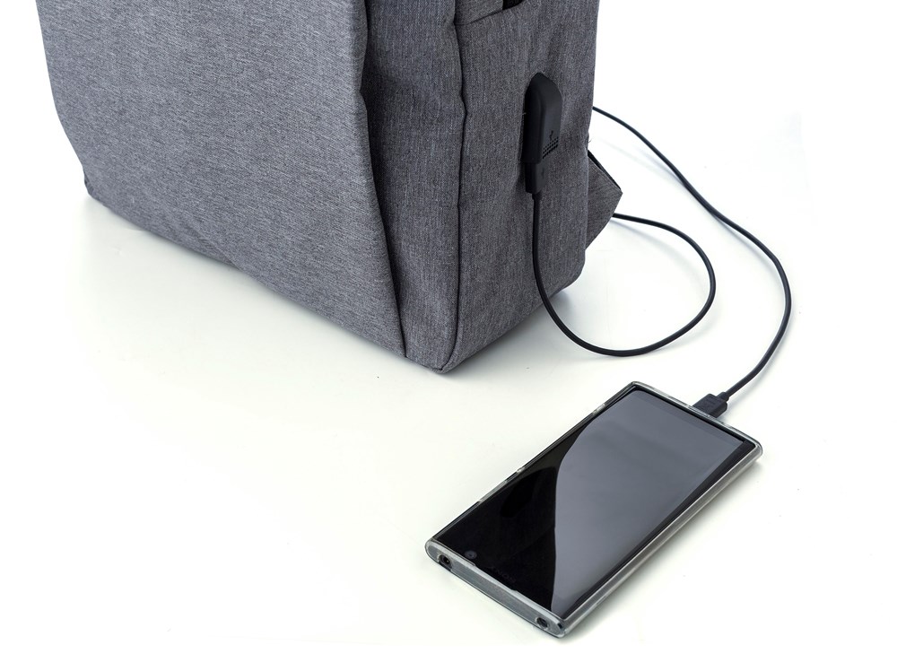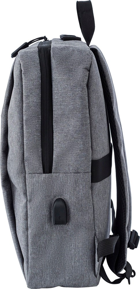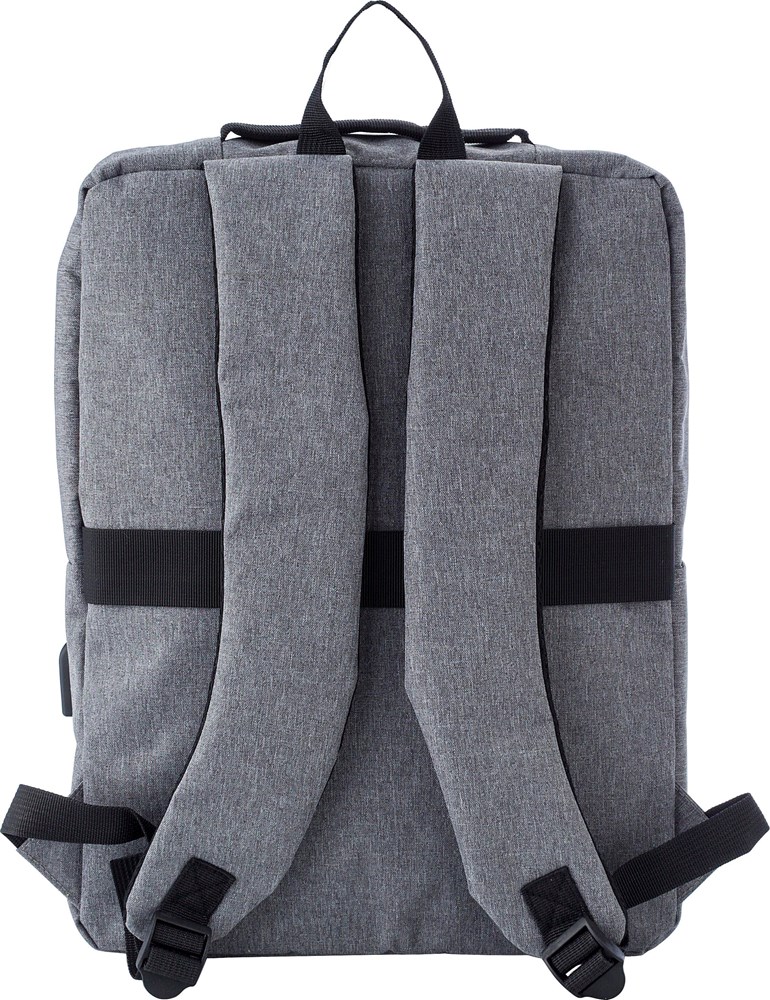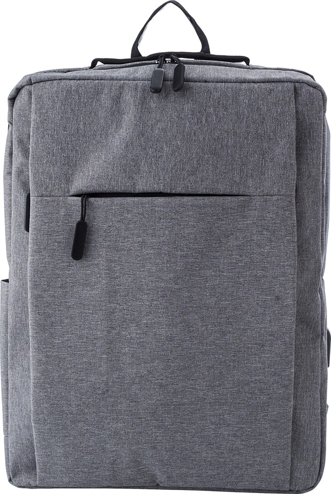 Polyester (600D) rugzak met hoofdvak met ritssluiting en voorvak. Met USB-uitgang aan de zijkant. Verstelbare gewatteerde schouderbanden.