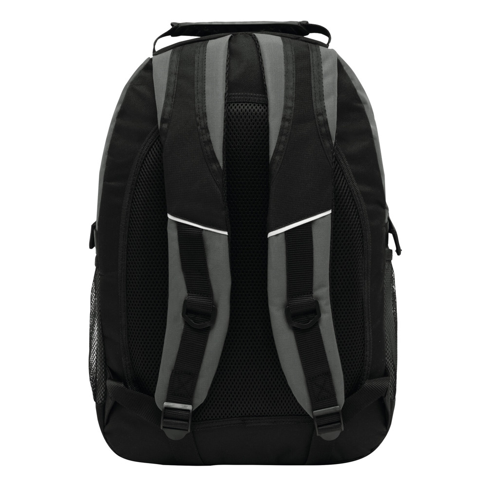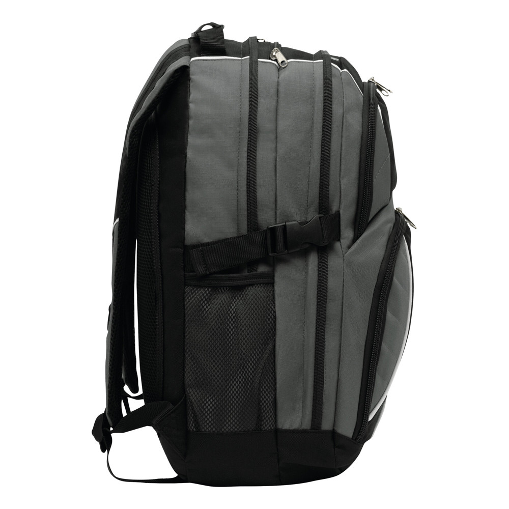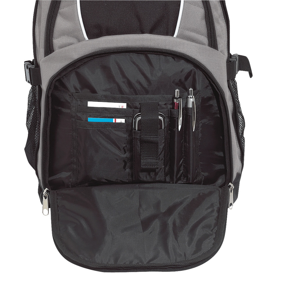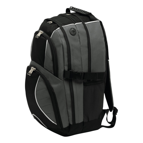 Luxe polyester rugzak/ laptoptas HYPE met meerdere, dmv een rits afsluitbare, vakken waaronder een gepolsterd laptopvak en een gepolsterd vak met kabeluitgang. De schouderbanden zijn gepolsterd en de draaggreep is extra verstevigd.