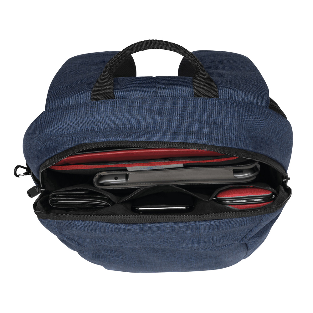 Rugtas PROTECT: voorvak met verticale rits, 1 groot hoofdvak met rits met laptopvak en 3 insteekvakken, buiten met verborgen karabijnhaak ter beveiliging van de rits tegen diefstal van de rugtas inhoud, handvat, ergonomisch gevormde en gefoamde schouderbanden, gefoamde achterkant met veiligheidsvak.