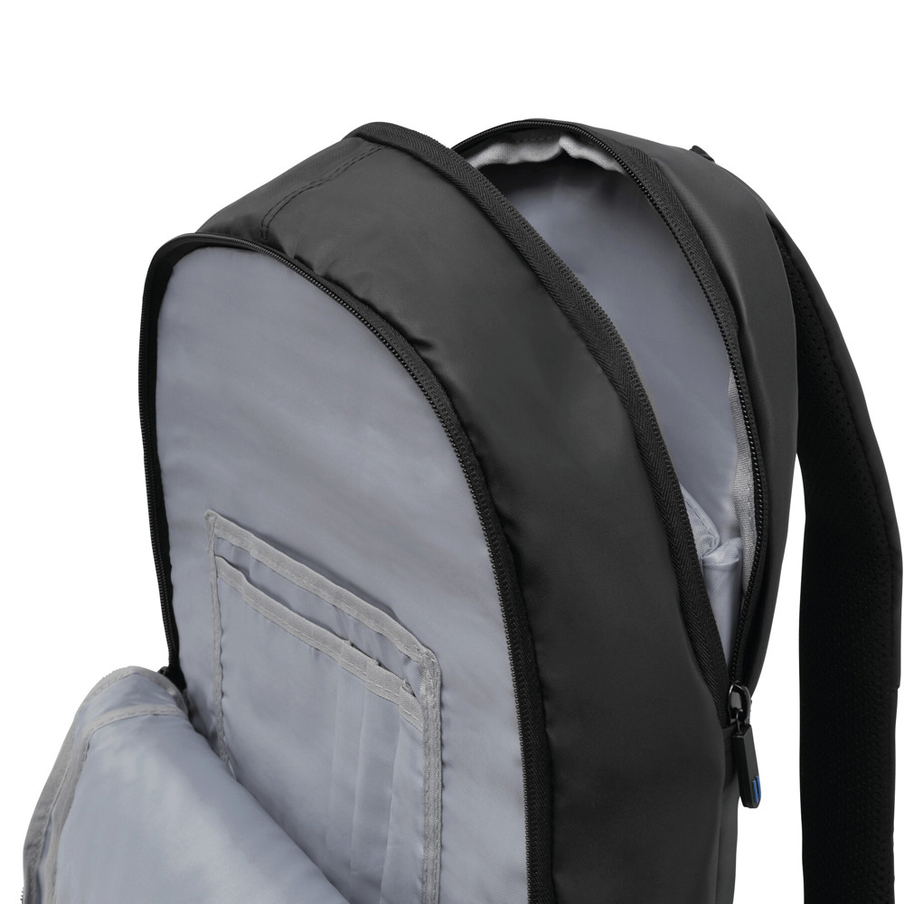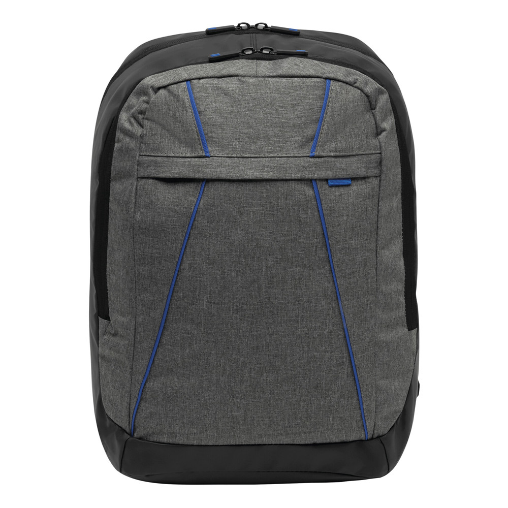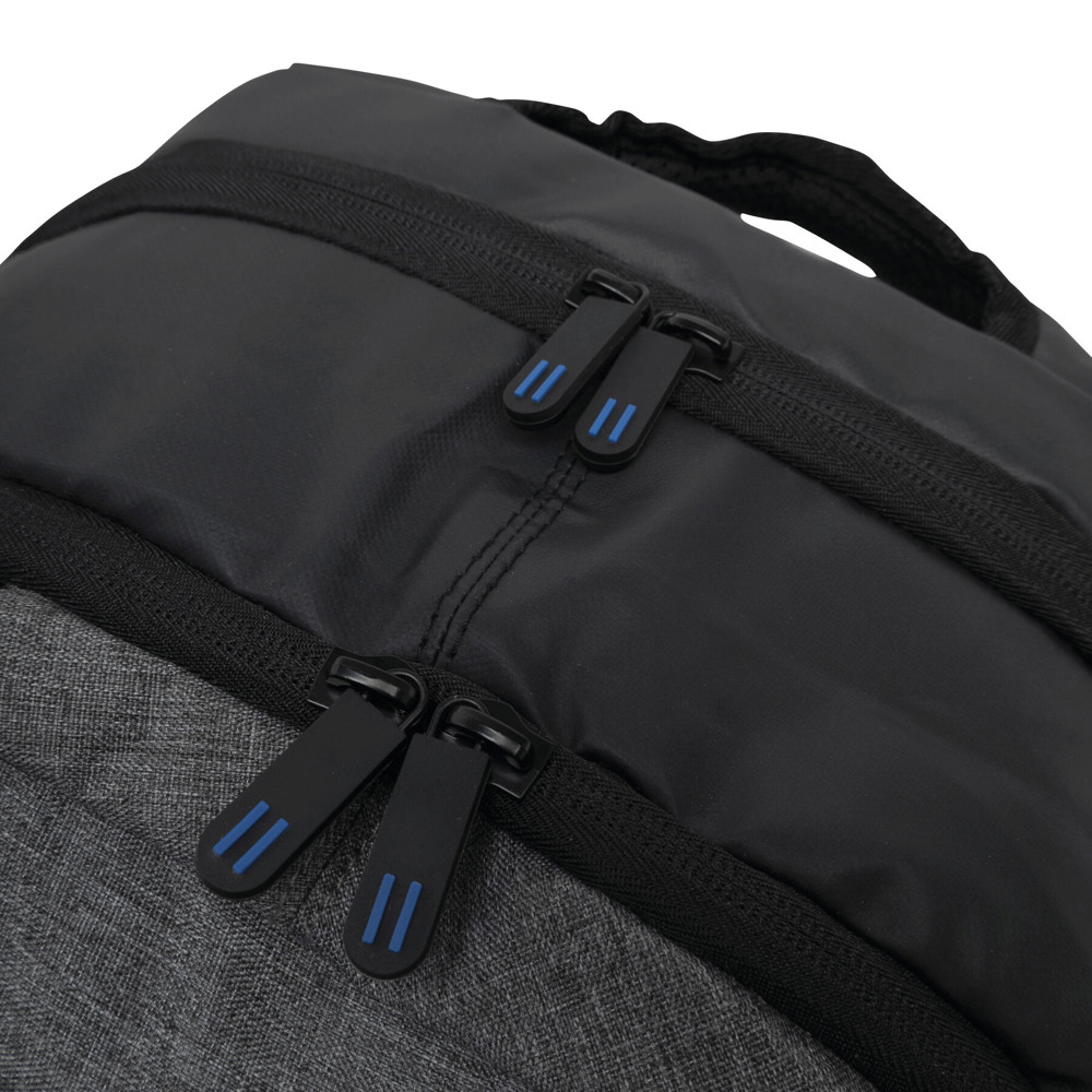 Rugtas SPLIT: 1 voorvak met rits, 2 hoofdvakken met rits, waarvan 1 met gefoamd notebookvak en 1 insteekvak , het andere hoofdvak met kleine organiser, handvat, gefoamde schouderbanden en rugpaneel