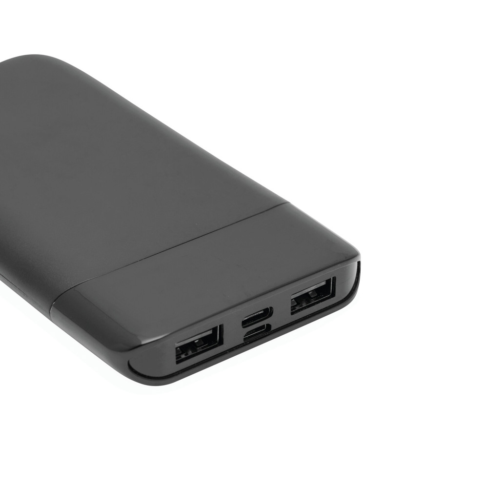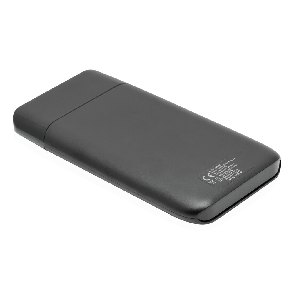 Powerbank BIG CAP, de perfecte energiereserve voor onderweg, geschikt voor Smartphones en USB-apparaten, incl. USB-oplaadkabel met Micro-USB stekker (lengte ca. 30 cm.) Aansluiting voor USB type C en Micro USB, aan/uitschakelaar, Input power 5V/2A, Output power 5V/2A, capaciteit 8.000 mAh, met laadindicatie in procenten.