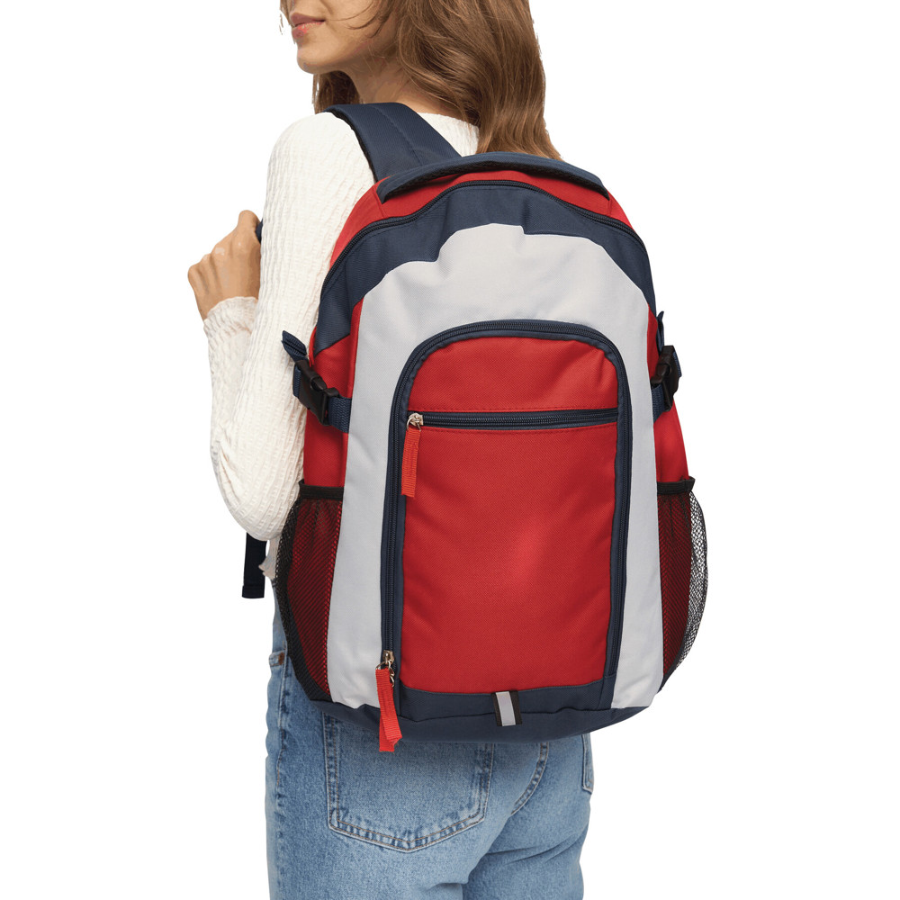 Rugzak MARINA van 600D polyester met gevoerde schouderbanden, handvat en diverse afsluitbare vakken.meer