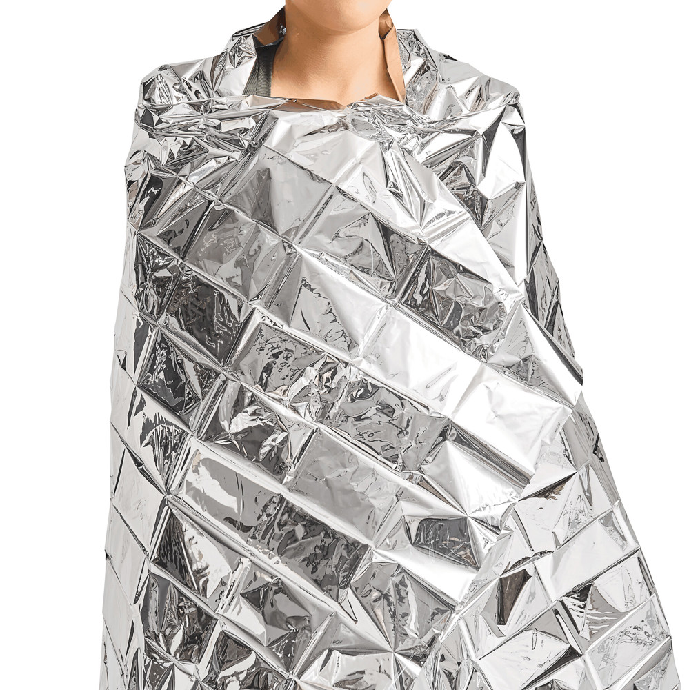 Reddingsdeken COVERING UP; isolatiedeken van polysterfolie (PET) met aluminium coating biedt bescherming bij onderkoeleing en oververhitting.