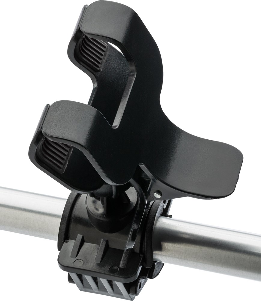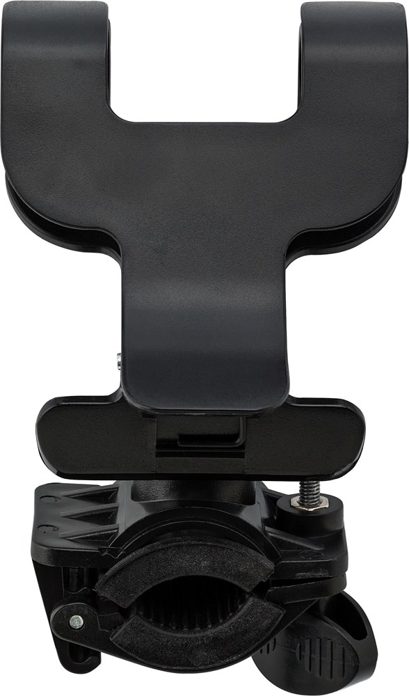 Kunststof verstelbare mobiele telefoonhouder voor op het stuur van een fiets. De telefoonhouder is verstelbaar in verschillende posities. De maximale stangdiameter is tussen de 15 en 19 mm, en de maximale opening voor de telefoonhouder is 9 cm.