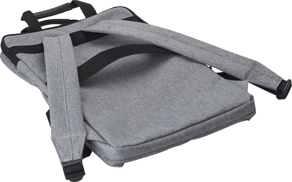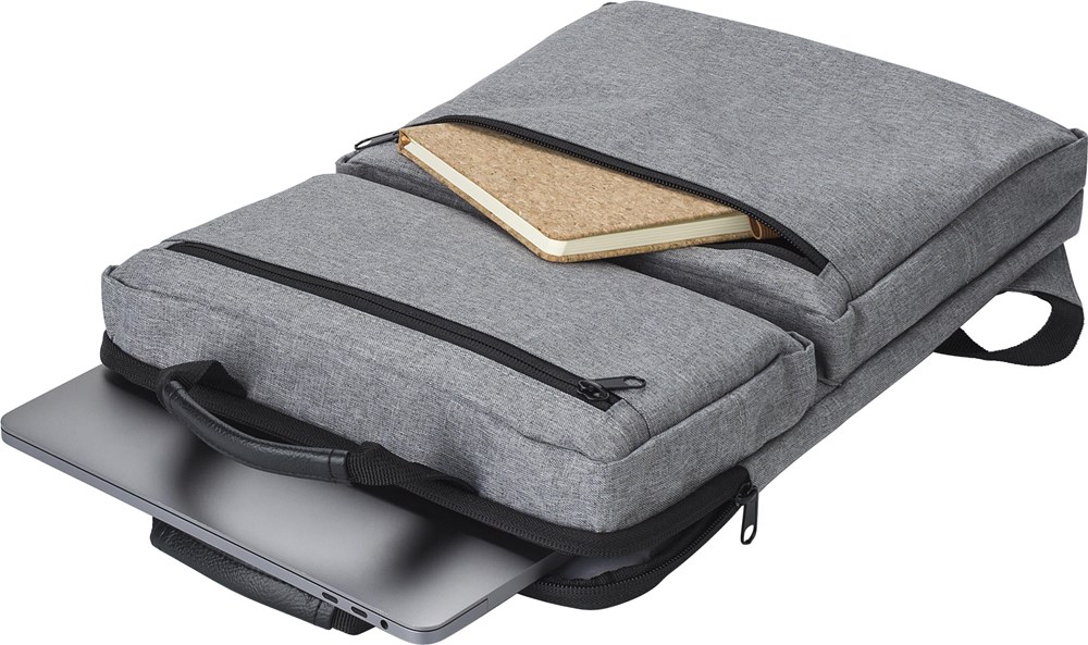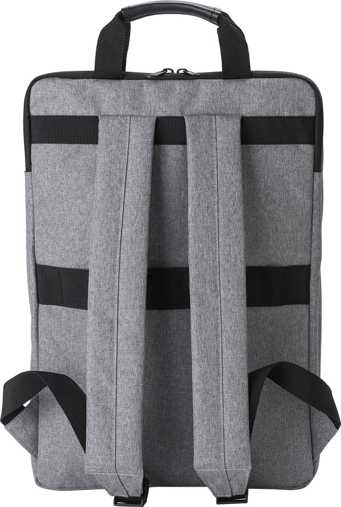Polycanvas (300D) rugzak met twee buitenvakken met ritssluiting en een laptopvak aan de binnenkant (15 inch). Met gewatteerde schouderbanden en twee korte handgrepen aan de bovenkant.