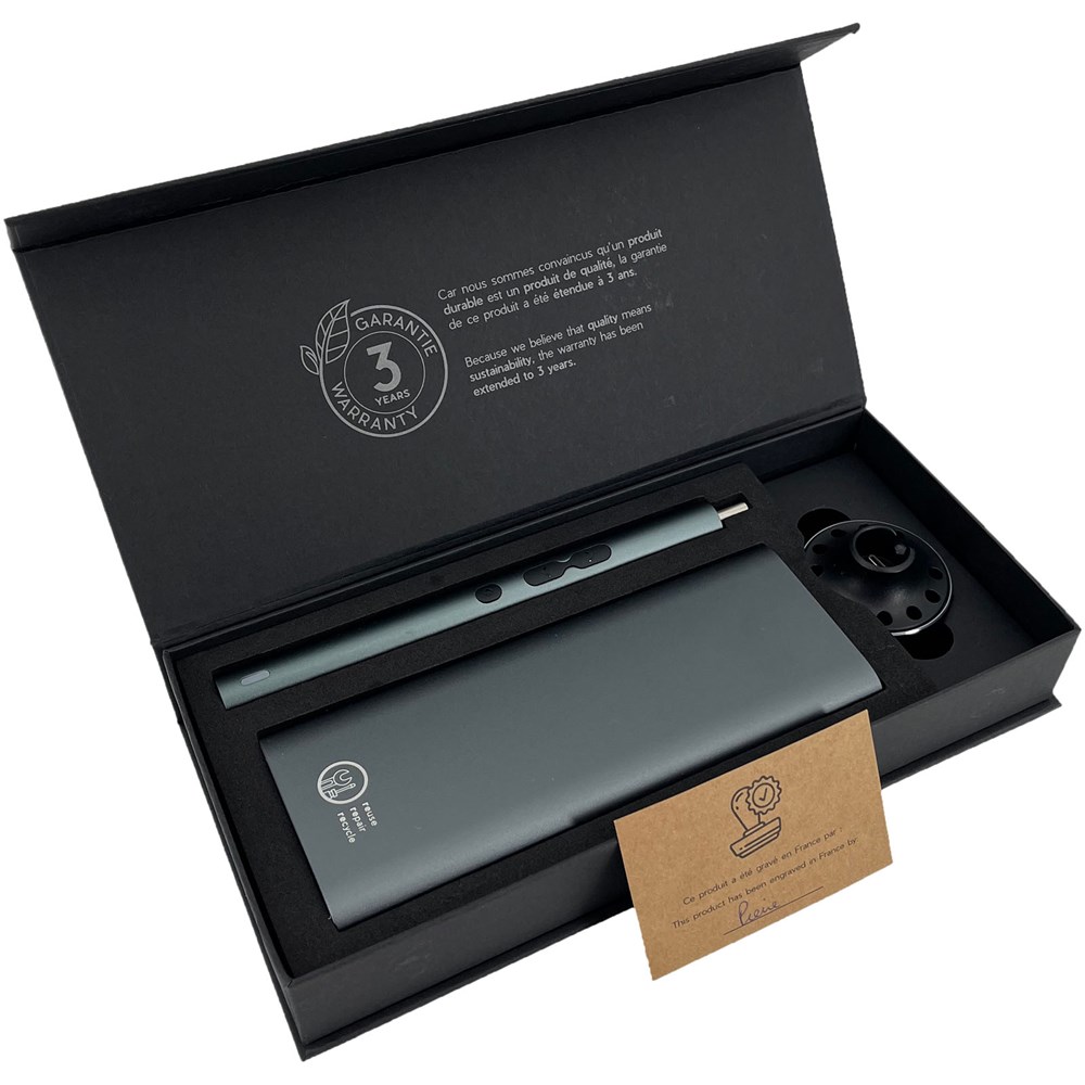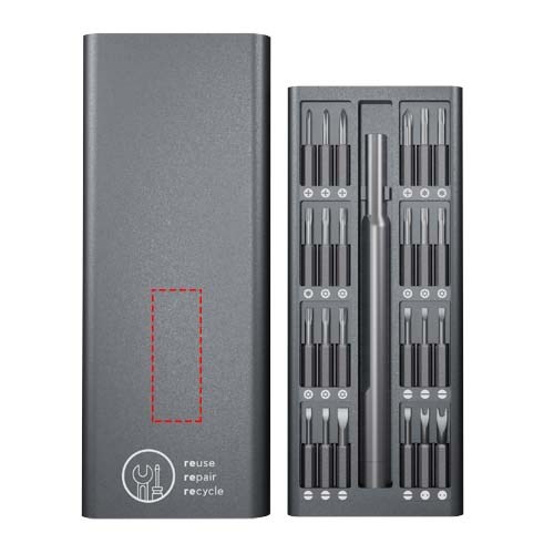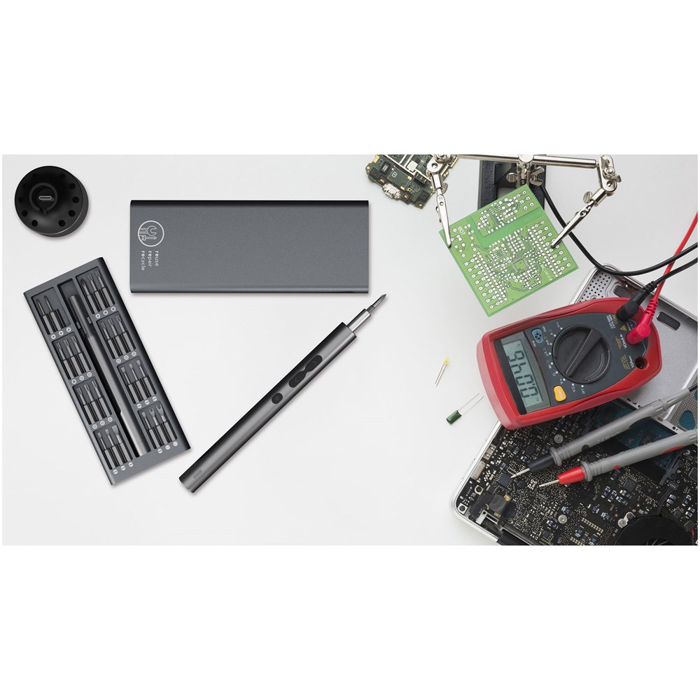 Alles-in-één aluminium schroevendraaierset inclusief een 48-bits handmatige precisieschroevendraaierset, een elektrische schroevendraaier, een oplaadstation en een koffer om alles op één plek te bewaren. De bits worden magnetisch door de schroevendraaier aangetrokken, waardoor ze gemakkelijk te hanteren zijn. Aan de ene kant van de set is 'REUSE REPAIR RECYCLE' gegraveerd en aan de andere kant kan een logo worden afgedrukt. De set beschikt over een grote verscheidenheid aan bits, waardoor deze universeel kan worden gebruikt voor vele soorten doe-het-zelfactiviteiten. Geleverd in een gerecyclede papieren geschenkverpakking met magnetische sluiting. Inclusief 3 jaar garantie.