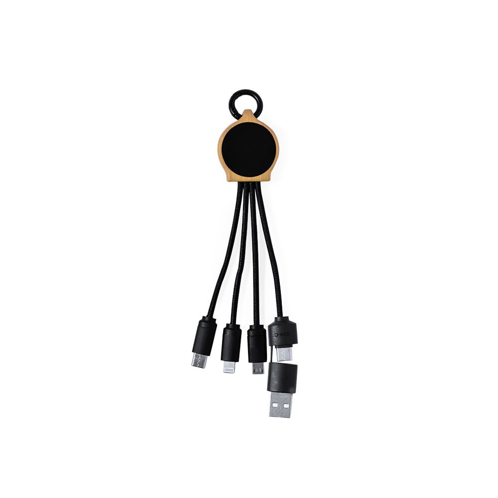 Oplaadkabel van bamboe met elegant zwart oppervlak, LED-licht aan de binnenkant en een speciaal voor lasergraveren ontworpen buitencoating die het logo verlicht. Met Type C- en USB-ingangen en Type C-, Lightning- en Micro USB-uitgangen. 5V gelijkstroom 2,4A. Gepresenteerd in een individuele zak met kraftpapier.