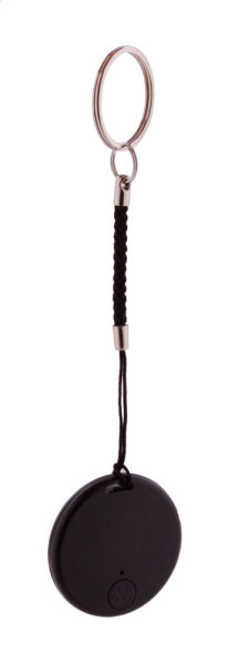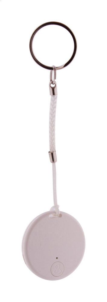 Draadloze anti-verloren sleutelvinder met camerasluiter, in ronde kunststof behuizing. Met koord en metalen sleutelring. Met knoopcelbatterij. Werkt met een gratis iOS / Android App.