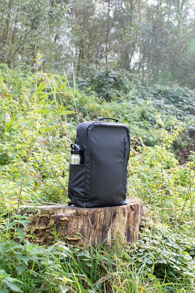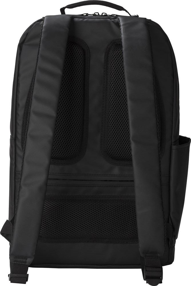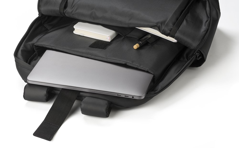 Polyester (600D) plunjezak. 210D polyester op de verduisterd, gecoat met 600D polyester. Waterafstotend, inclusief opgenomen. Met antidiefstalvak, bidonvak, laptopvak met klittenbandsluiting en andere kleine klemmen.