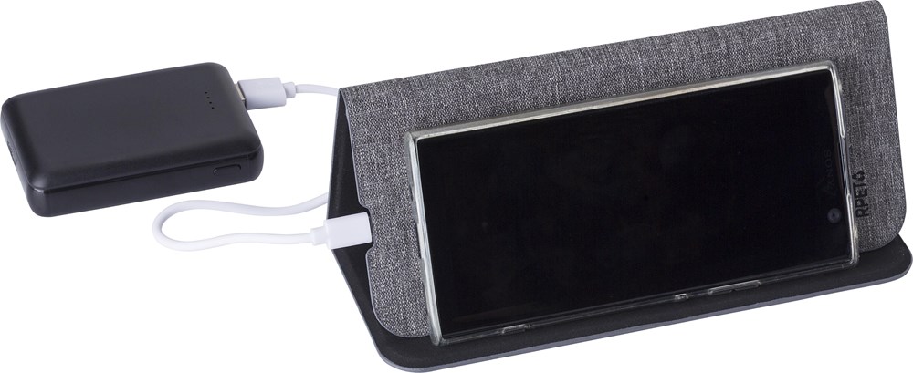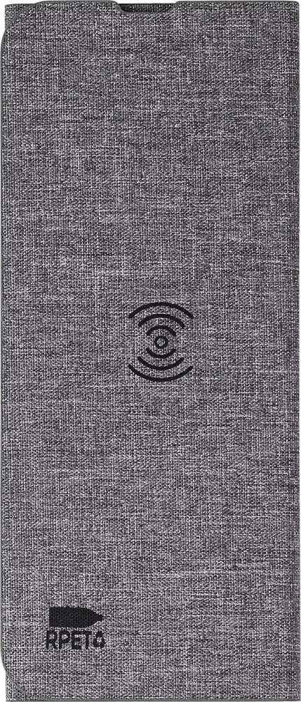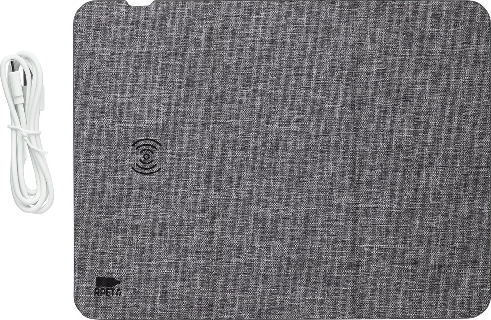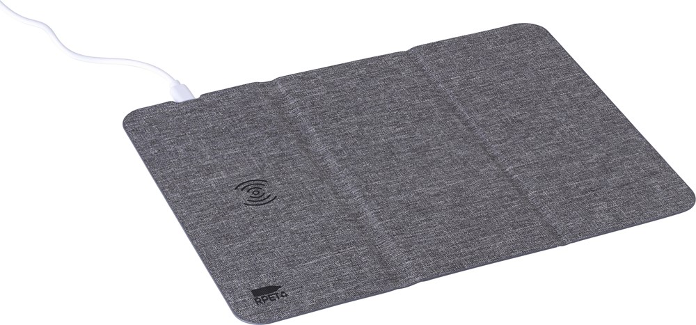 rPET draadloze snellader muismat (10W). Opvouwbaar om te gebruiken als telefoonstandaard. Met rPET-logo. Verpakt per stuk in bruin kartonnen doos.