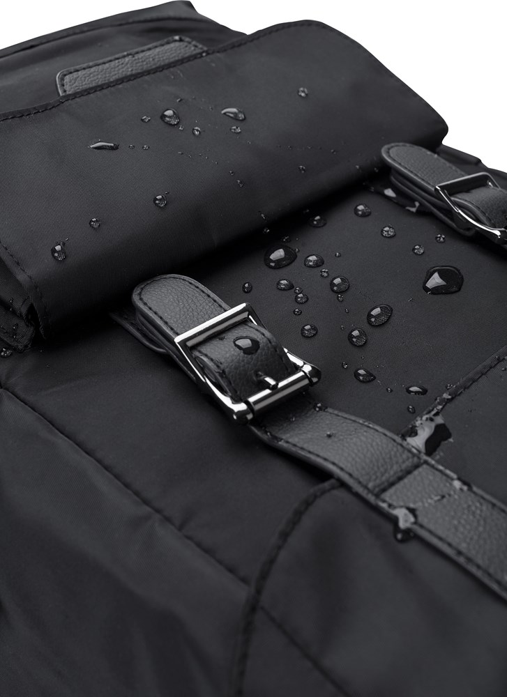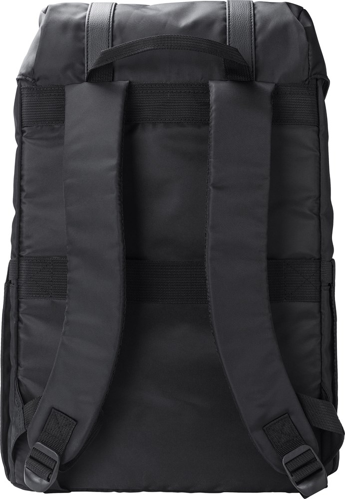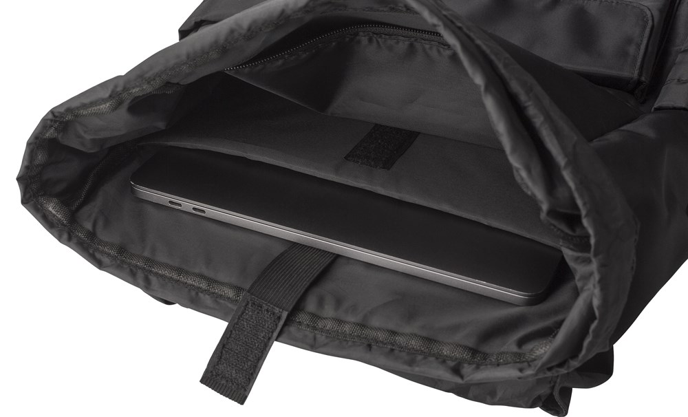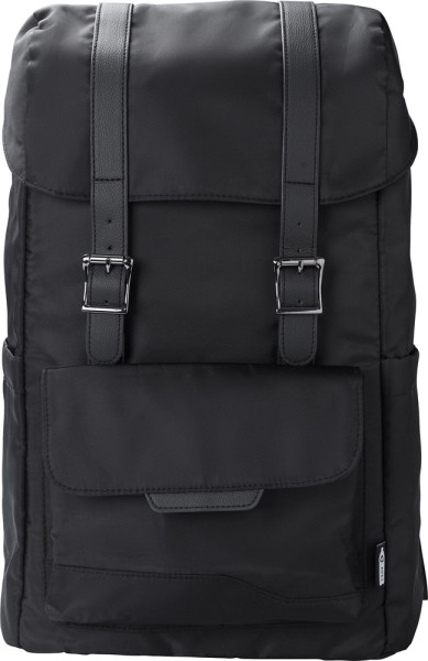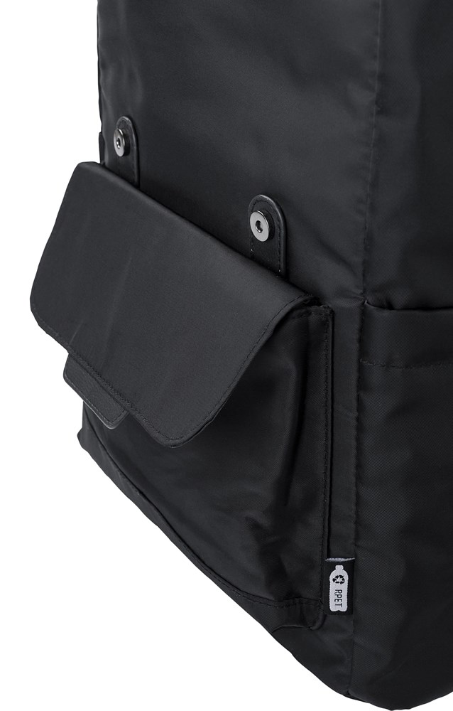 rPET (290T) polyester keperstof rugzak met flap en PU-banden. Twee flessenvakken aan de zijkanten. Zak met magneetsluiting aan de voorkant. Trekkoordsluiting voor binnenzak. Laptop (15 inch) en normaal pokdalig. Trolleyband aan de achterkant. Waterafstotende coating.
