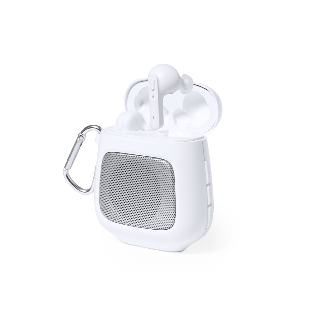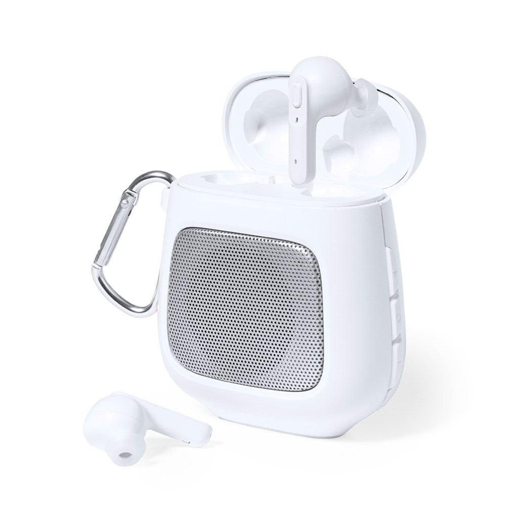 Unieke luidspreker-hoofdtelefoon met Bluetooth® 5.0-aansluiting, gemaakt van resistent ABS in wit. De set bevat een Bluetooth®-luidspreker met 3W vermogen, handsfree-functie en karabijnhaak. Deze wordt compleet gemaakt door een paar oortelefoons met geïntegreerde bedieningsknop en 30 mAh batterij per stuk. 600 mAh oplaadstation, met LED-laadstatuslampje. Individueel verpakt in een kraftdoos, met handleiding in het Engels en Spaans.