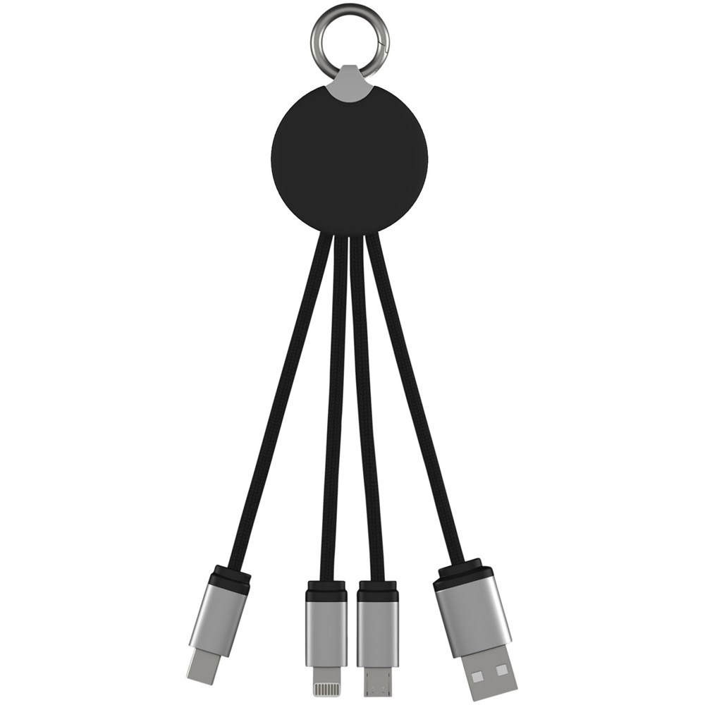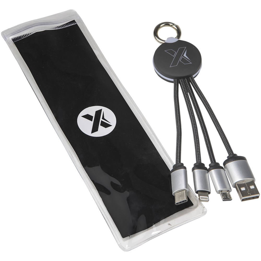 Oplaadkabel met oplichtend logo en rubberen en metalen afwerking, uitgerust met drie aansluitingen (Type C, Android, iPhone). Maximaal drie apparaten kunnen tegelijkertijd worden opgeladen. Lengte van de kabels (inclusief stekkers): 10 cm. RPET kunststof kabel en de verpakking is gemaakt van gerecycled papier en gerecyclede kunststof.