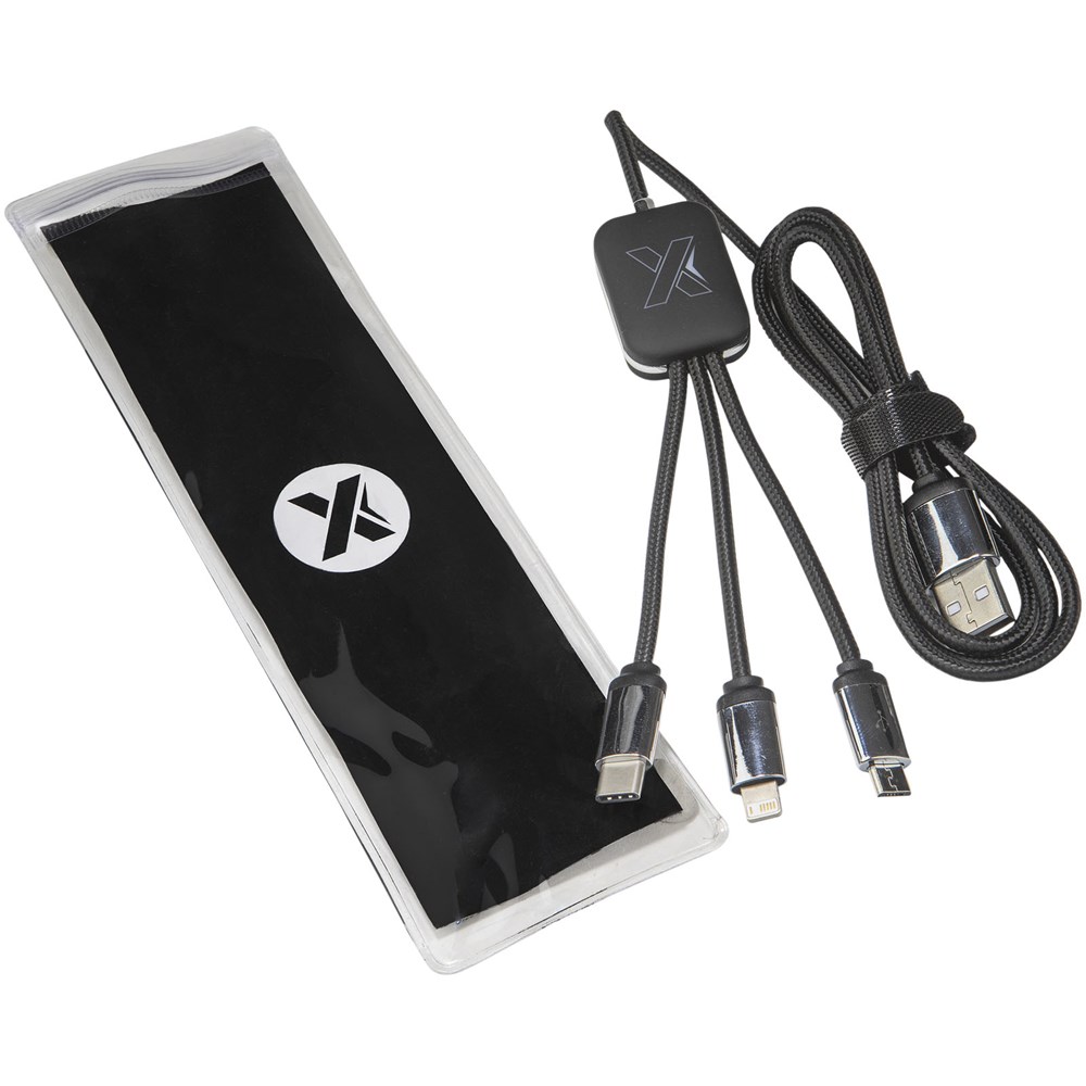 Oplaadkabel met oplichtend logo en rubberen en metalen afwerking, uitgerust met drie aansluitingen (Type C, Android, iPhone). Maximaal drie apparaten kunnen tegelijkertijd worden opgeladen. Lengte van de kabels (inclusief stekkers): 10 cm. Totale kabellengte: 1 meter. Recycled PET kunststof kabel en de verpakking is gemaakt van gerecycled papier en gerecyclede kunststof.