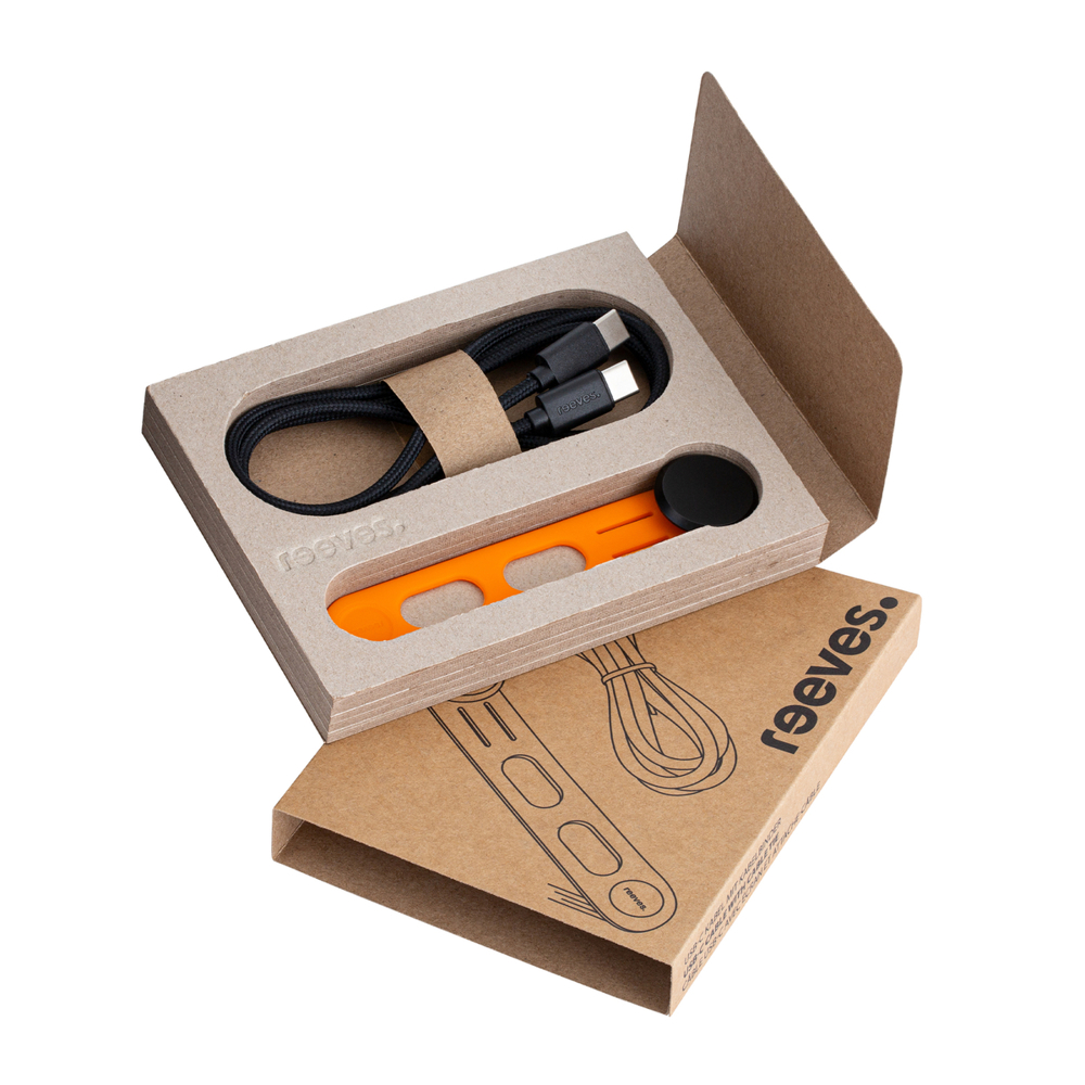 REEVES-Convertics Tie is een exclusief ontwerp van REFLECTS®, waarbij creatief design en uitstekende functionaliteit perfect worden gecombineerd. De siliconen kabelbinder is verkrijgbaar in zes kleuren, van levendig rood en oranje tot tijdloos zwart en wit. Met de kabelbinder kan de meegeleverde USB-C naar USB-C-kabel handig worden gebundeld en meegenomen. Tijdens het opladen kunt u de 1 meter lange oplaadkabel in de daarvoor bestemde gleuven vastzetten. Zo voorkomt u mogelijk verlies van de houder. De oplaadkabel van gerecycled PET en TPE-kunststof biedt een vermogen tot 60 watt. Ideaal voor snel opladen en gegevensoverdracht. De textielcoating zorgt bovendien voor een hoogwaardige uitstraling. De ronde plaat van gerecycled aluminium op de kabelhouder biedt het perfecte podium voor uw logo. Bewerking kan via lasergravure, tampondruk of doming. Een hoogwaardige geschenkverpakking maakt het artikel compleet.