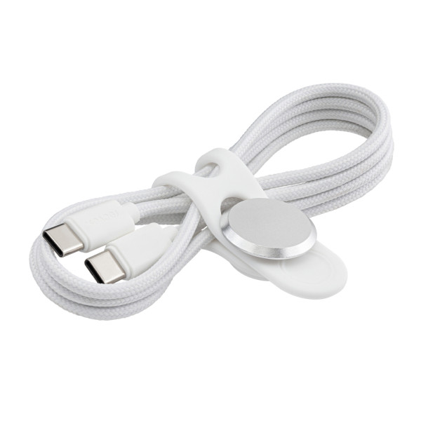 REEVES-Convertics Tie is een exclusief ontwerp van REFLECTS®, waarbij creatief design en uitstekende functionaliteit perfect worden gecombineerd. De siliconen kabelbinder is verkrijgbaar in zes kleuren, van levendig rood en oranje tot tijdloos zwart en wit. Met de kabelbinder kan de meegeleverde USB-C naar USB-C-kabel handig worden gebundeld en meegenomen. Tijdens het opladen kunt u de 1 meter lange oplaadkabel in de daarvoor bestemde gleuven vastzetten. Zo voorkomt u mogelijk verlies van de houder. De oplaadkabel van gerecycled PET en TPE-kunststof biedt een vermogen tot 60 watt. Ideaal voor snel opladen en gegevensoverdracht. De textielcoating zorgt bovendien voor een hoogwaardige uitstraling. De ronde plaat van gerecycled aluminium op de kabelhouder biedt het perfecte podium voor uw logo. Bewerking kan via lasergravure, tampondruk of doming. Een hoogwaardige geschenkverpakking maakt het artikel compleet.