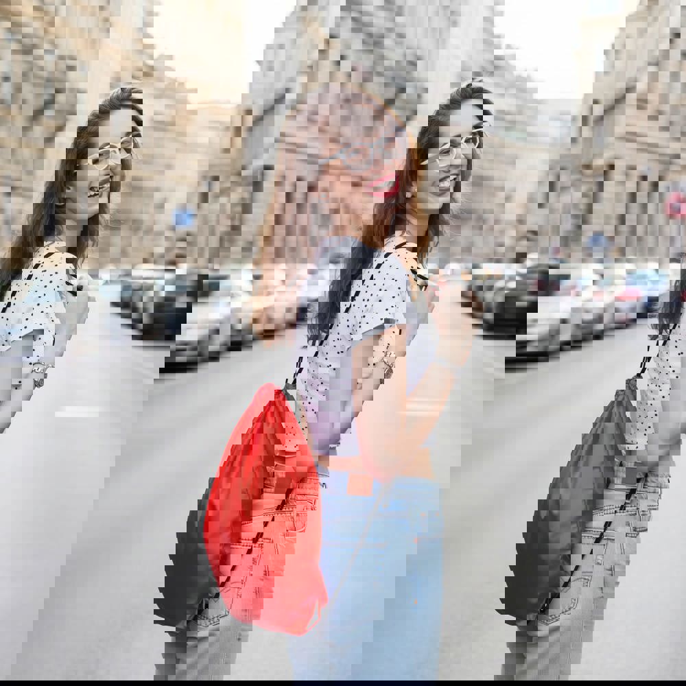 Polyester rugzak. Met trekkoord als sluiting.