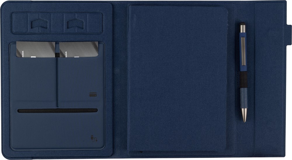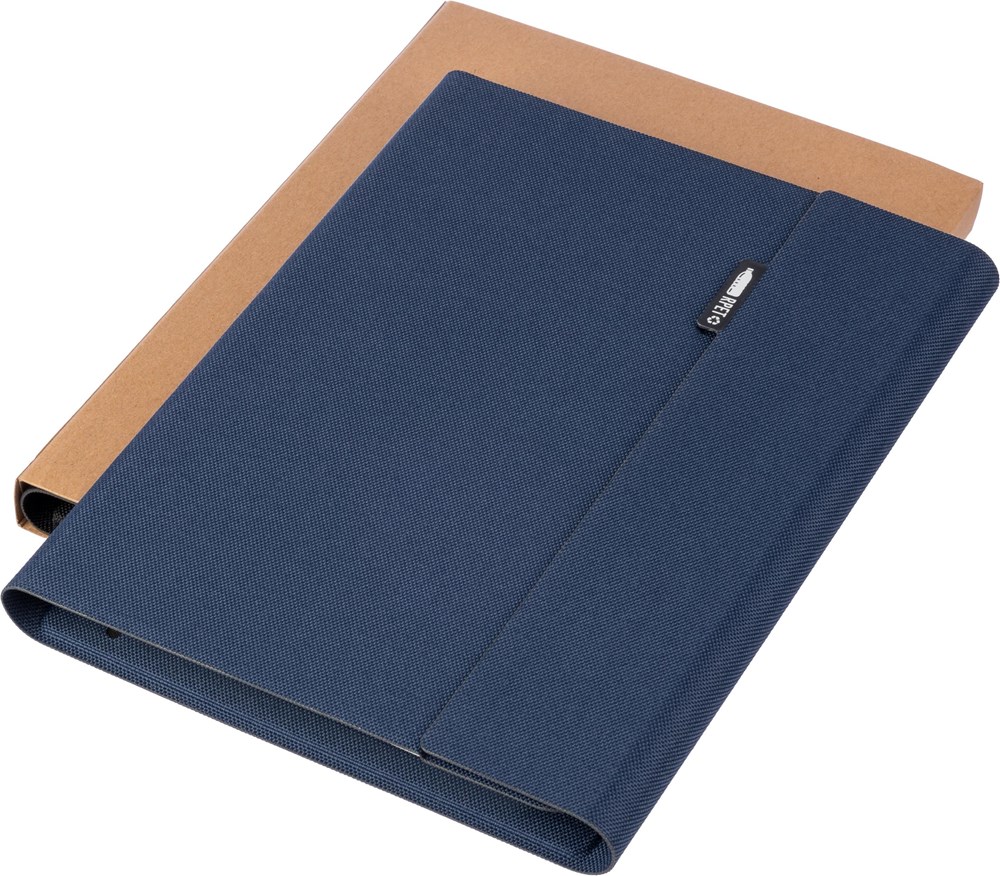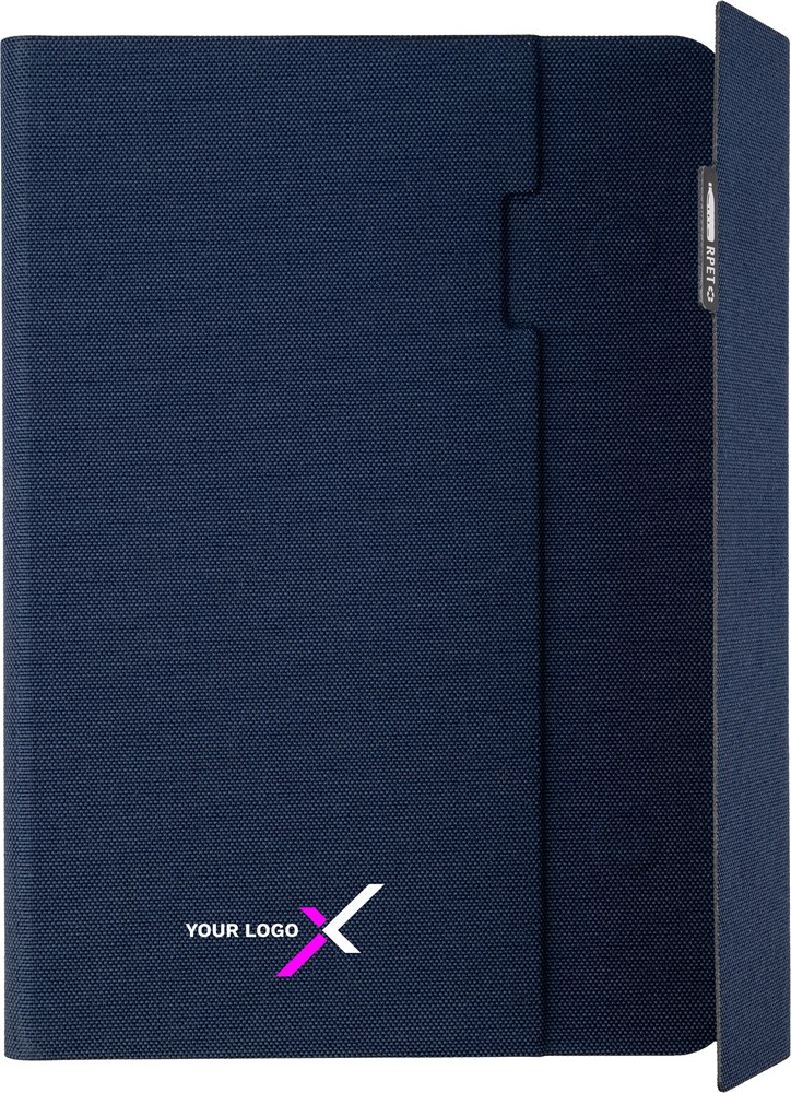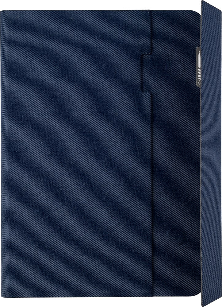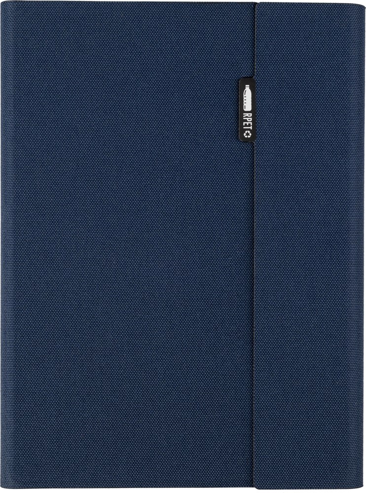 rPET map (ca. A5) met gelaste afwerking. Inclusief notitieboek met 64 gelinieerde pagina’s (70 gram), meerdere vakken en een telefoonhouder. Magnetische sluiting. Individueel verpakt in een kraft hoes.