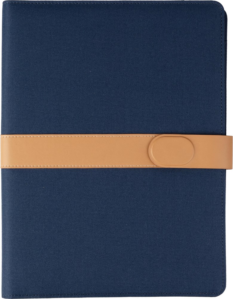 rPET opvouwbare map (ca. A4) met PU-detail op de omslag. Inclusief notitieboek met 20 gelinieerde pagina’s (70 gram), meerdere vakken en een pennenlus. Magnetische sluiting. Individueel verpakt in een kraft hoes.