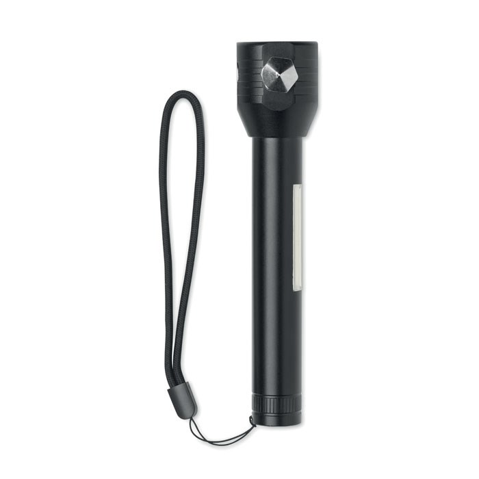 3 in 1 aluminium zaklamp met noodhamer en veiligheidsgordelsnijder. Hij heeft een COB-lamp aan de zijkant en voorkant. Inclusief magneet en polsband. Inclusief ingebouwde oplaadbare 500mAh batterij.