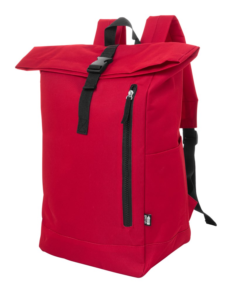 RPET rolltop rugzak met gespsluiting, laptop (14") compartiment en voorvak met ritssluiting. Met gewatteerde rug- en schouderbanden. 600D RPET polyester met opvallend RPET label.