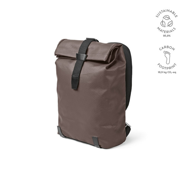 Deze waterbestendige 23L rugzak is een duurzame verbintenis: gemaakt van gerecycled katoenen canvas met PU-coating (340 gsm) en gerecyclede PU-details. Met een gewatteerd vak voor een laptop (17") en 2 interne zakken. Wordt geleverd in een individuele tas van gerecycled katoen.
