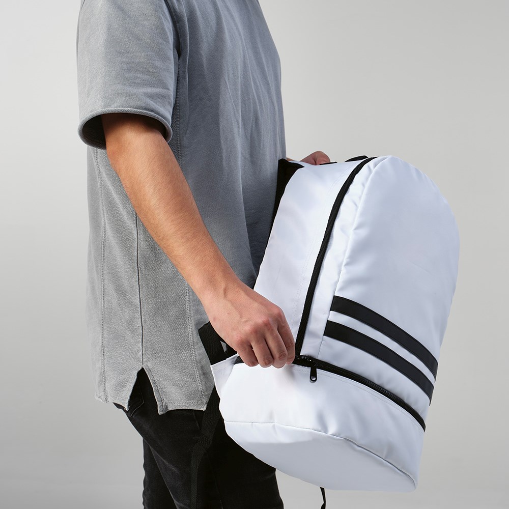 Deze rugzak van 25 liter is gemaakt van rPET en ontworpen op basis van functionaliteit. Met rugvulling, een versterkt handvat bovenaan en twee zwarte reflecterende stroken vooraan voor de veiligheid. Aan de onderkant zit een apart vak dat ideaal is voor schoenen. Een ontwerp gericht op functionaliteit.