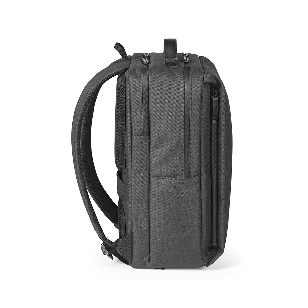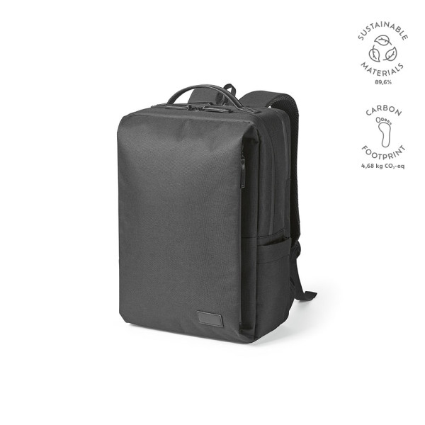 Onze 20L rugzak is een zorgvuldig vervaardigd ontwerp van 600D gerecycled polyester. Voorzien van 2 ruime vakken, waterdichte ritsen, een trolleyband en een gewatteerd vak voor een 15,6'' laptop. Geleverd met een individuele tas van gerecycled katoen.