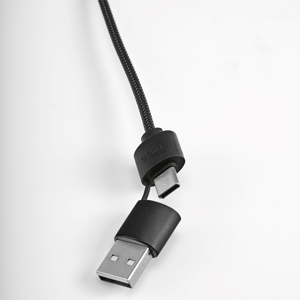 Onze innovatieve 5-in-1 snellaadkabel. Met connectoren voor USB-A, USB-C, Micro-USB en Lightning is het een veelzijdige metgezel. De kabel is verpakt in een individuele kartonnen doos en toont duurzaamheid met zijn rPET-jasje.