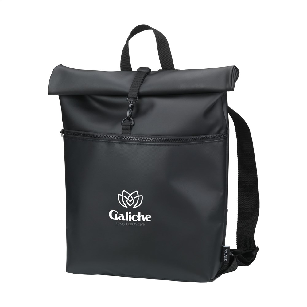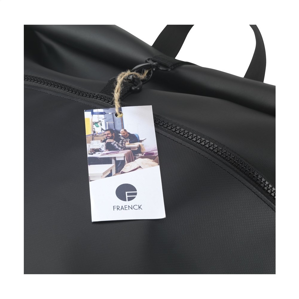 Stoere rugzak van het merk Fraenck. Gemaakt van imitatieleer en geüpcycled zeildoek. Het stevige en waterafstotende materiaal komt van geüpcyclede restantmaterialen uit de zeilmakerij. Het royale binnenvak is voorzien van een extra vak geschikt voor het opbergen van een laptop tot 17 inch. Met een stevige ritssluiting, verstelbare schouderbanden en een draaglus. Een tijdloos design. Made in Holland. Inhoud ca. 14 liter.