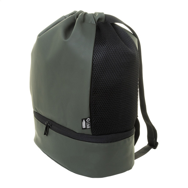Premium RPET-tas met trekkoord met schoenvak met ritssluiting, mesh zij-inlays en brede riemen. PU gecoat 600D RPET polyester met onderscheidend RPET-label.