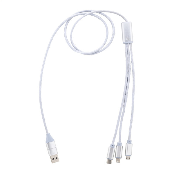 Gerecycled aluminium en RPET USB-oplaadkabel met micro-USB-, USB-C- en Lightning-connectoren. Met USB- en USB-C-ingangen. Lengte kabel: 100 cm.