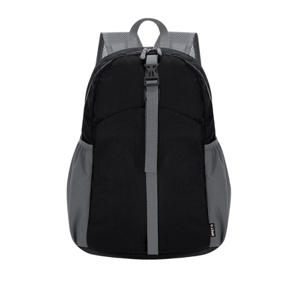 Opvouwbare rugzak in zachte RPET 210D Ripstop polyester. Hoofdvak met dubbele rits, binnenvak met dubbele functie en voorvak met druksluiting. Versterkte hoeken met gaas, verstelbare schouderbanden en accessoires in grijs. Klein opgevouwen formaat, met een handvat voor transport. RPET-label op het etiket.Het RPET-materiaal is gemaakt van gerecycled plastic, ter bevordering van het hergebruik van plasticafval en ter ondersteuning van de duurzaamheid van de planeet.