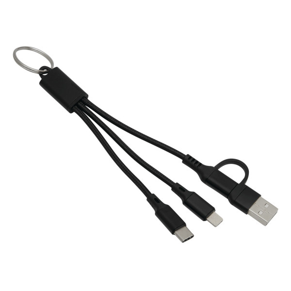 Oplaadkabel FANTAIL: voor het opladen van elektronische apparaten, lengte ca. 18 cm, met sleutelring, incl. 2 oplaadstekkers: USB type C en combistekker Micro-USB / Lightning®, ingangsstekker USB TYPE C incl. adapter voor USB type A.