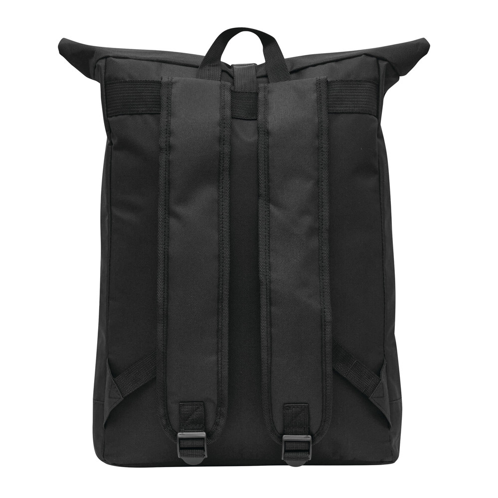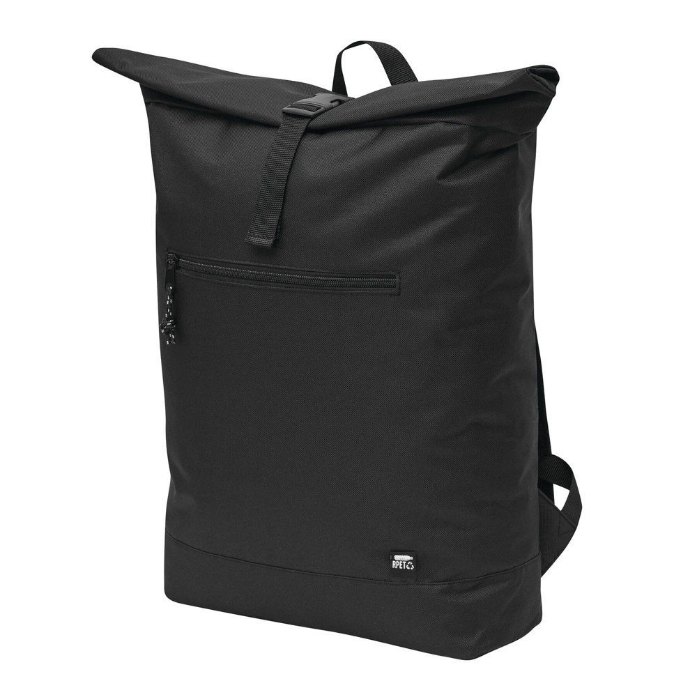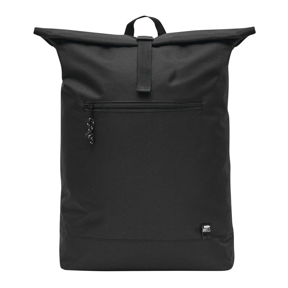 Rugtas ROLL-TOP: gemaakt van gerecycled kunststof (RPET), voorvak met horizontale ritssluiting, groot hoofdvak met gefoamd binnenvak voor laptop of tablet, kan worden opgerold en gesloten met een drukknoop, draagriem, gefoamde bodem, schouderbanden en rugpand.