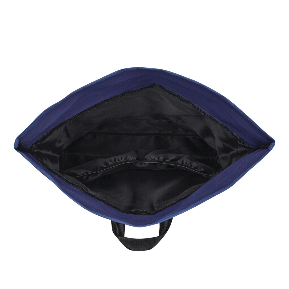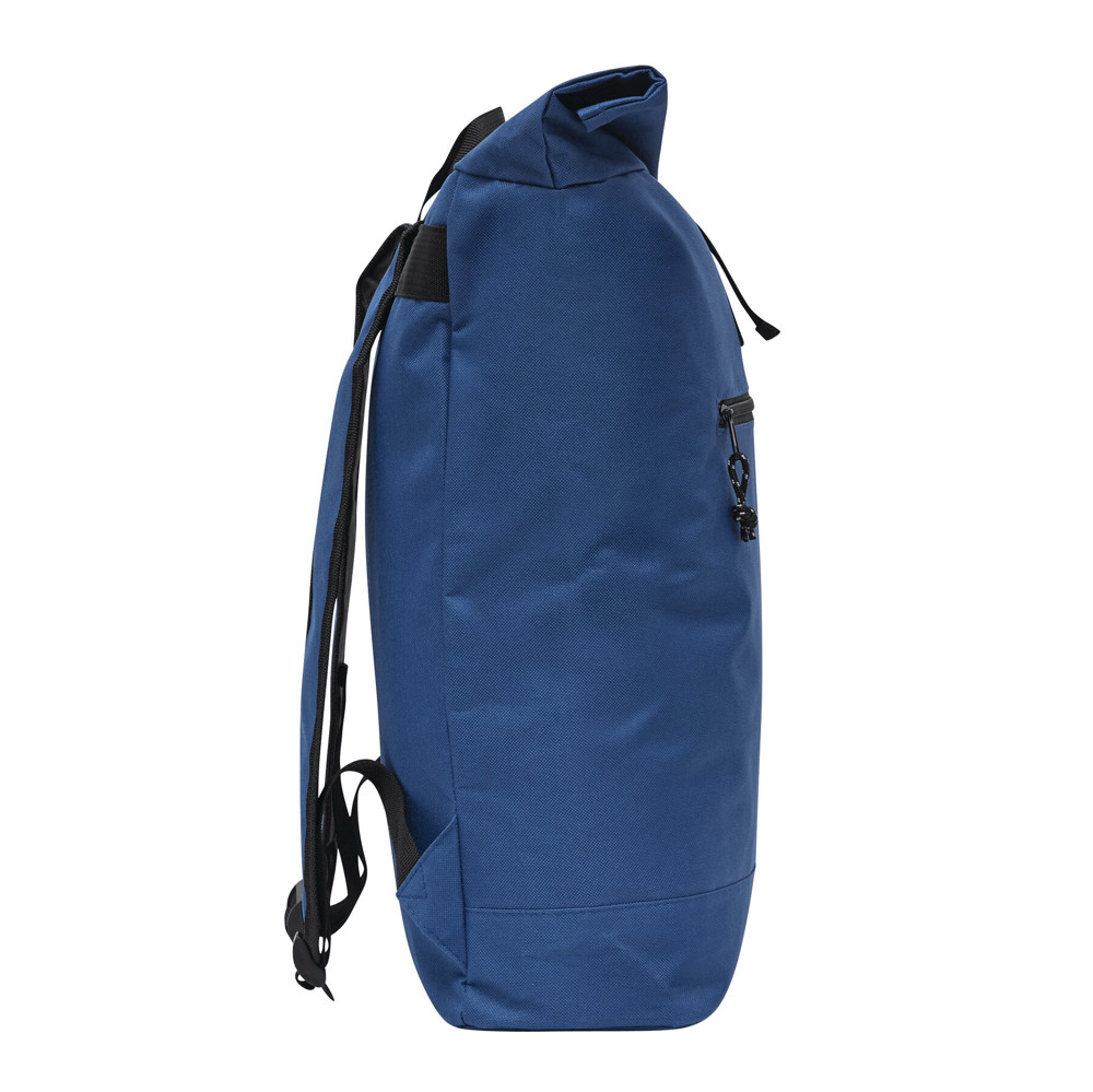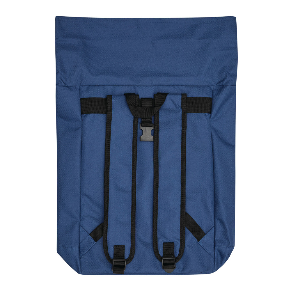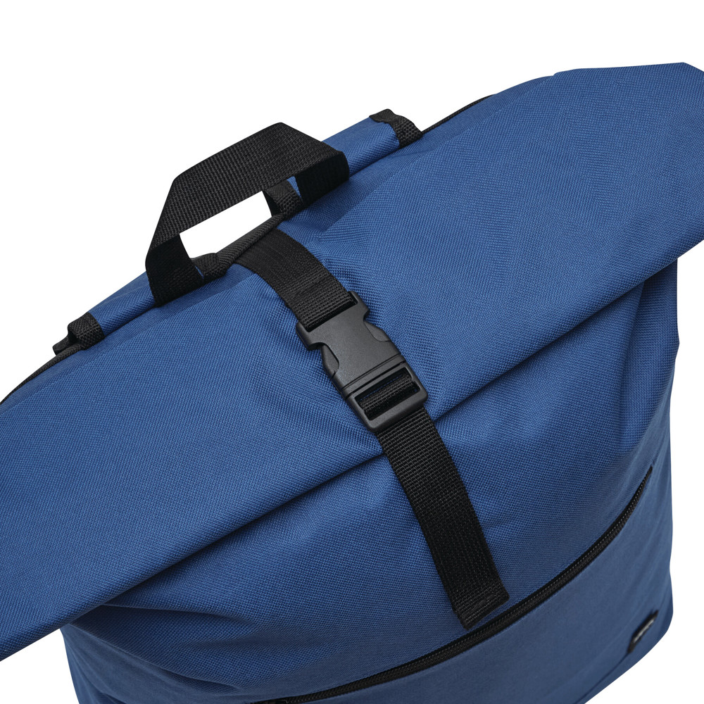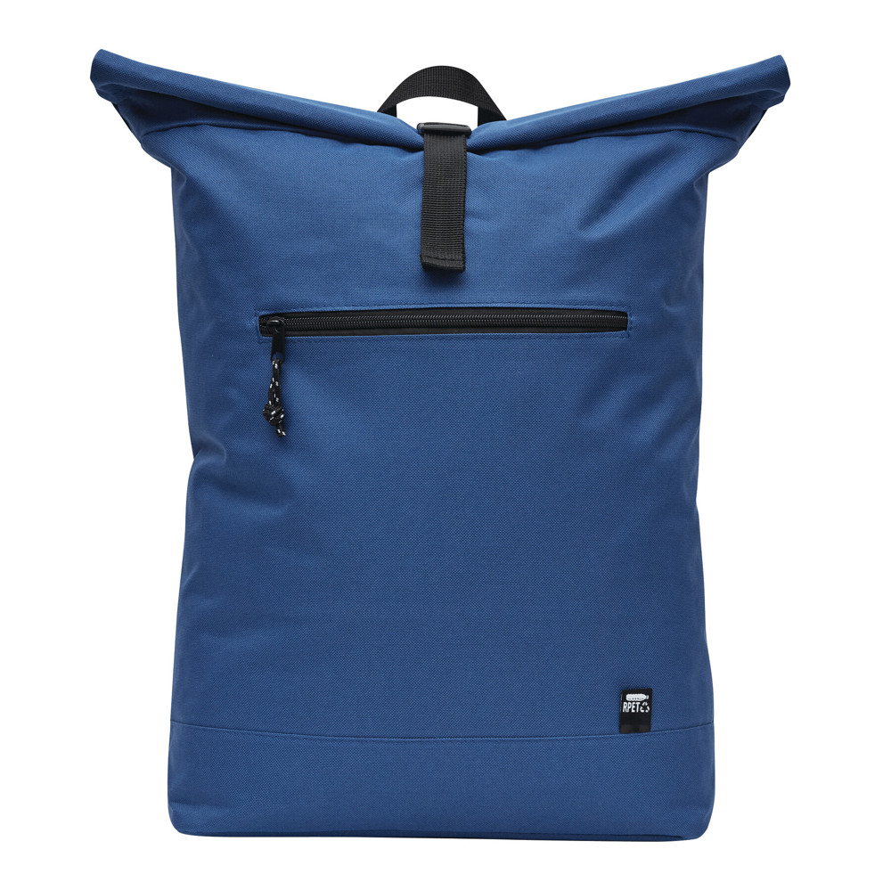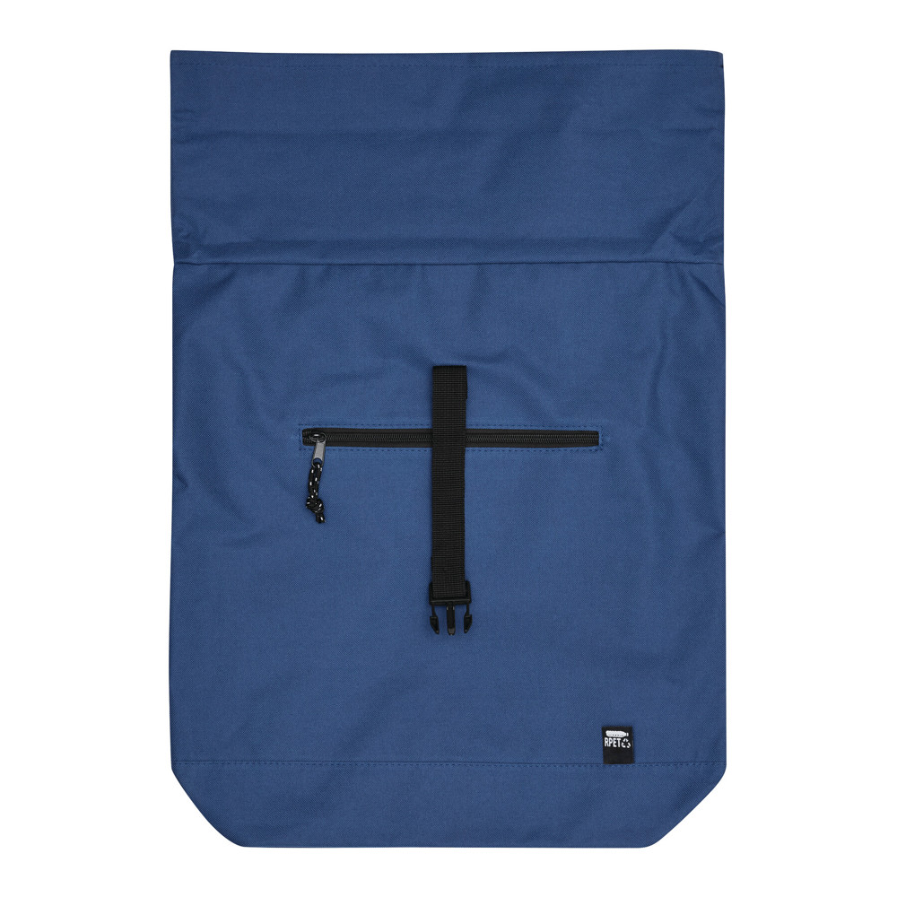 Rugtas ROLL-TOP: gemaakt van gerecycled kunststof (RPET), voorvak met horizontale ritssluiting, groot hoofdvak met gefoamd binnenvak voor laptop of tablet, kan worden opgerold en gesloten met een drukknoop, draagriem, gefoamde bodem, schouderbanden en rugpand.