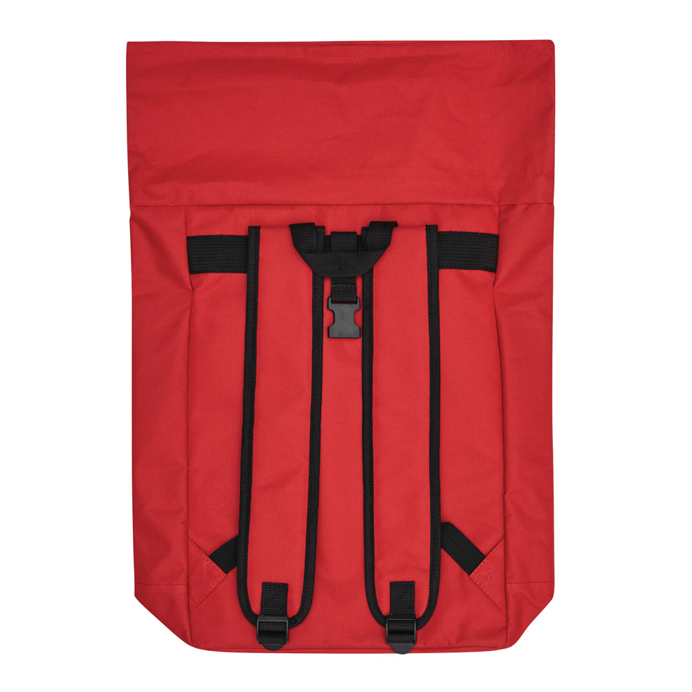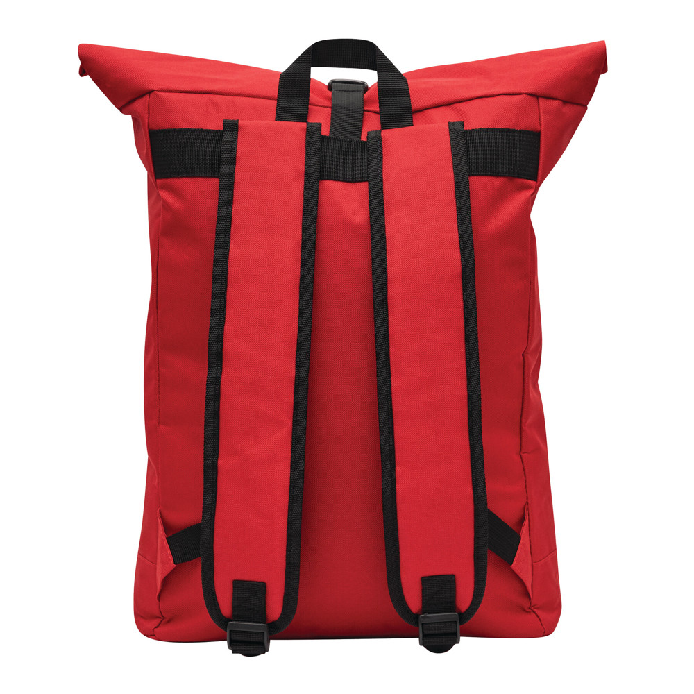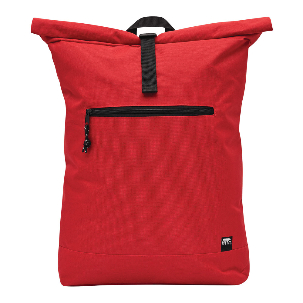 Rugtas ROLL-TOP: gemaakt van gerecycled kunststof (RPET), voorvak met horizontale ritssluiting, groot hoofdvak met gefoamd binnenvak voor laptop of tablet, kan worden opgerold en gesloten met een drukknoop, draagriem, gefoamde bodem, schouderbanden en rugpand.