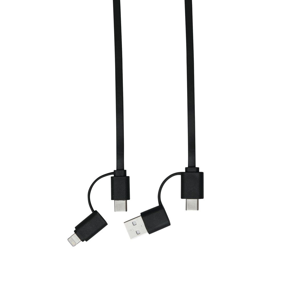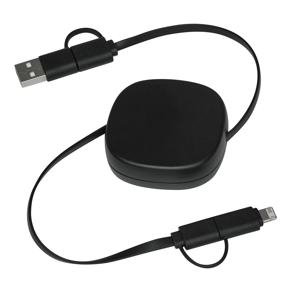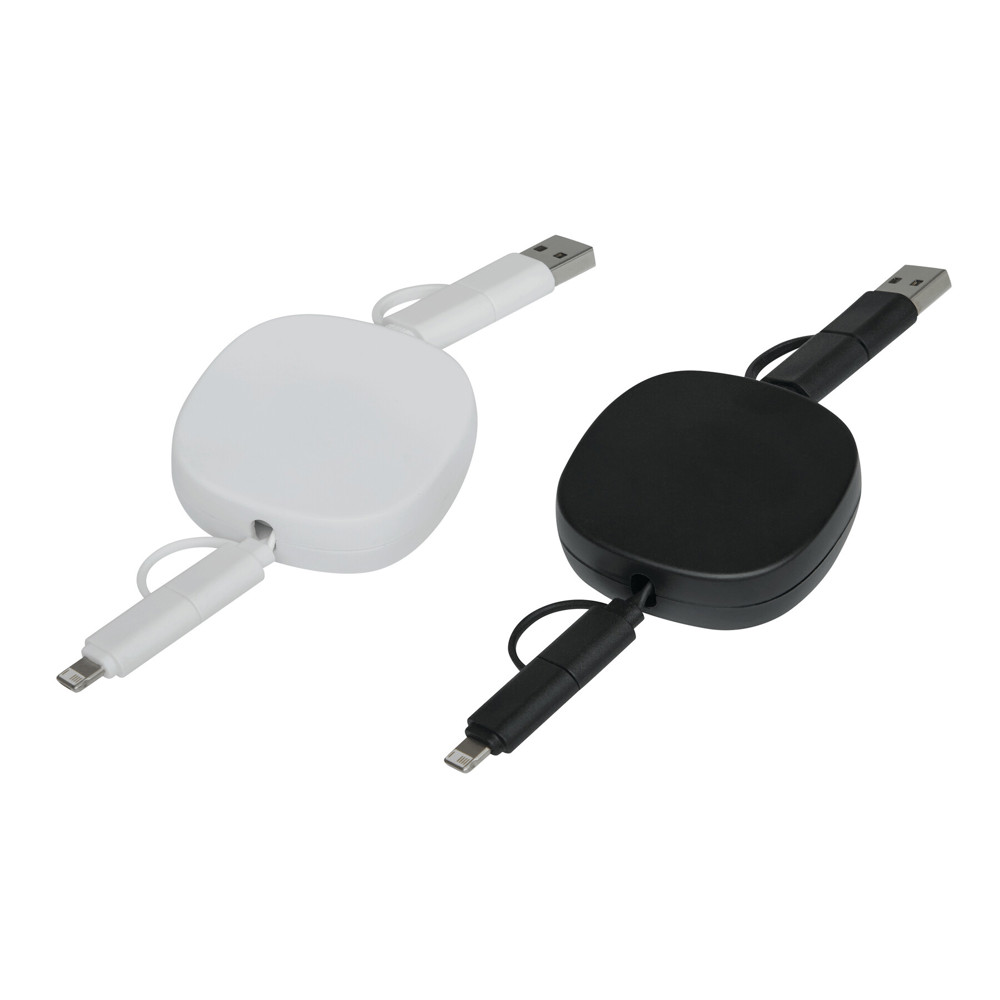 Oplaad- en datakabel TRANSFER SQUARE: oprolbaar (lengte ca. 92 cm), voor het opladen van elektronische apparaten, inclusief laptops (65 W vermogen), en voor gegevensoverdracht, met gecombineerde USB type A / type C ingangsstekker en gecombineerde USB type C / micro USB / Lightning® uitgangsstekker.
