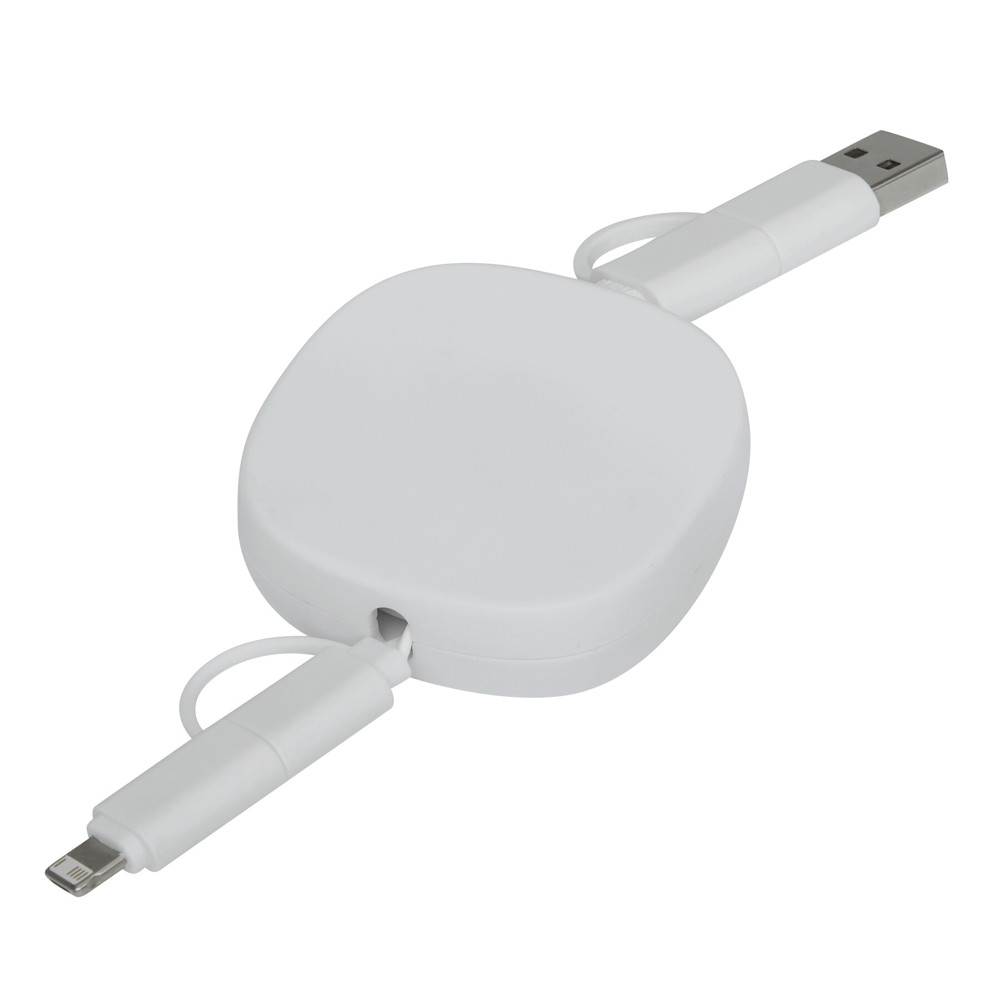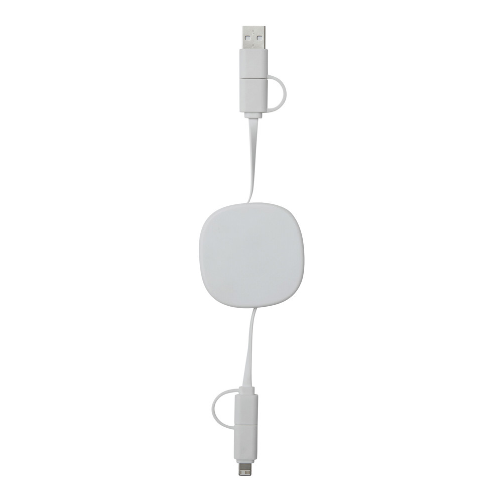 Oplaad- en datakabel TRANSFER SQUARE: oprolbaar (lengte ca. 92 cm), voor het opladen van elektronische apparaten, inclusief laptops (65 W vermogen), en voor gegevensoverdracht, met gecombineerde USB type A / type C ingangsstekker en gecombineerde USB type C / micro USB / Lightning® uitgangsstekker.