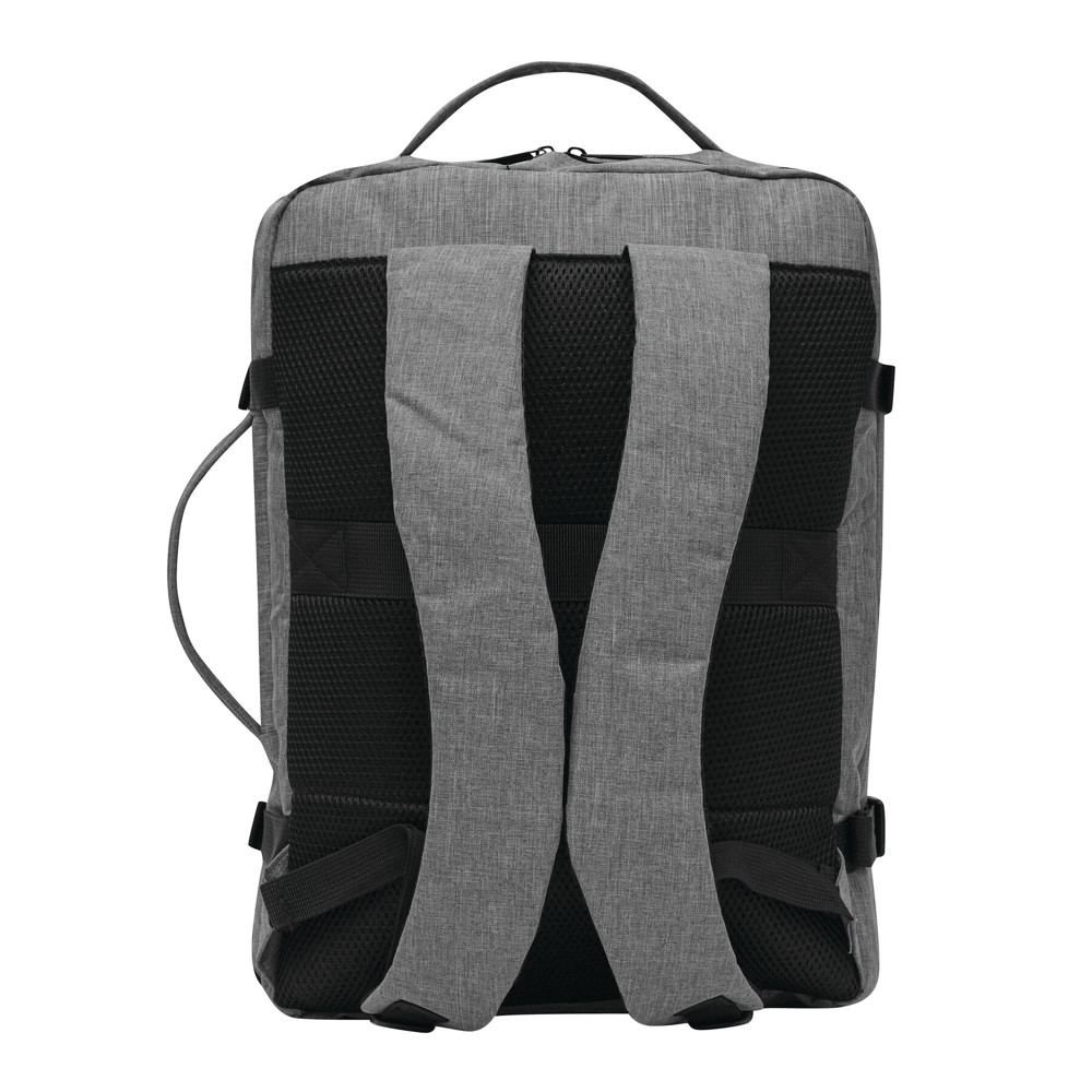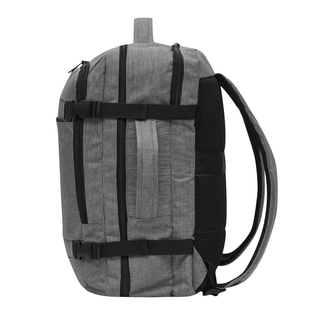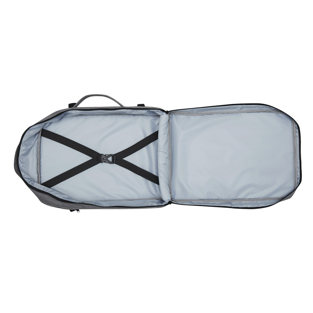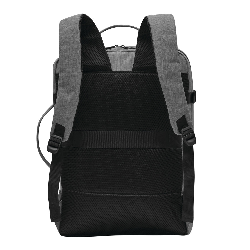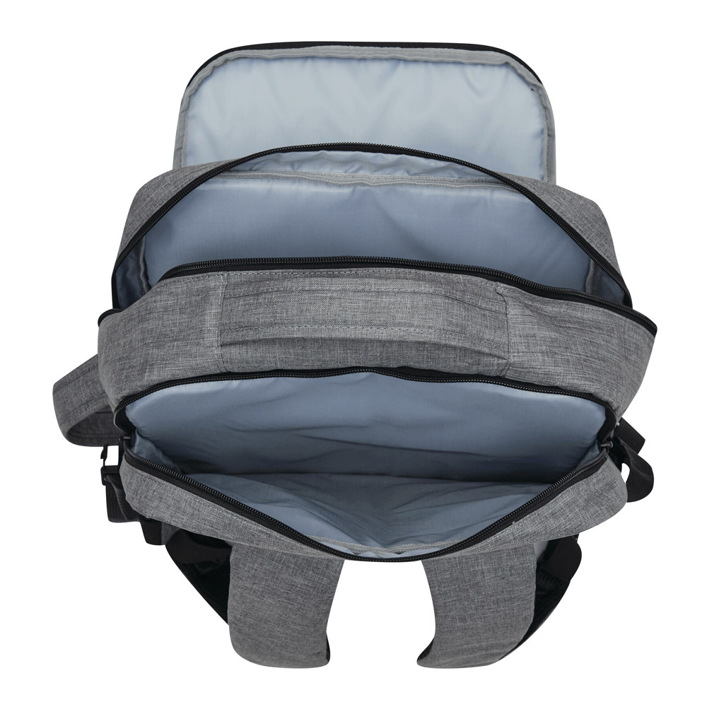 Rugzak STEWARD: 2 ritsvakjes aan de voorkant, waarvan één met organizer (3 steekvakken, 2 pennenlussen), 1 groot, gewatteerd hoofdvak met rits en elastische band, 1 gewatteerd laptopvak met rits, versterkte boven- en zijgrepen, gewatteerde schouderriemen in ergonomische vorm en gewatteerd rugpaneel, riem aan de achterkant voor reporterfunctie, aan beide zijden 2 compressiebanden met kliksluiting.