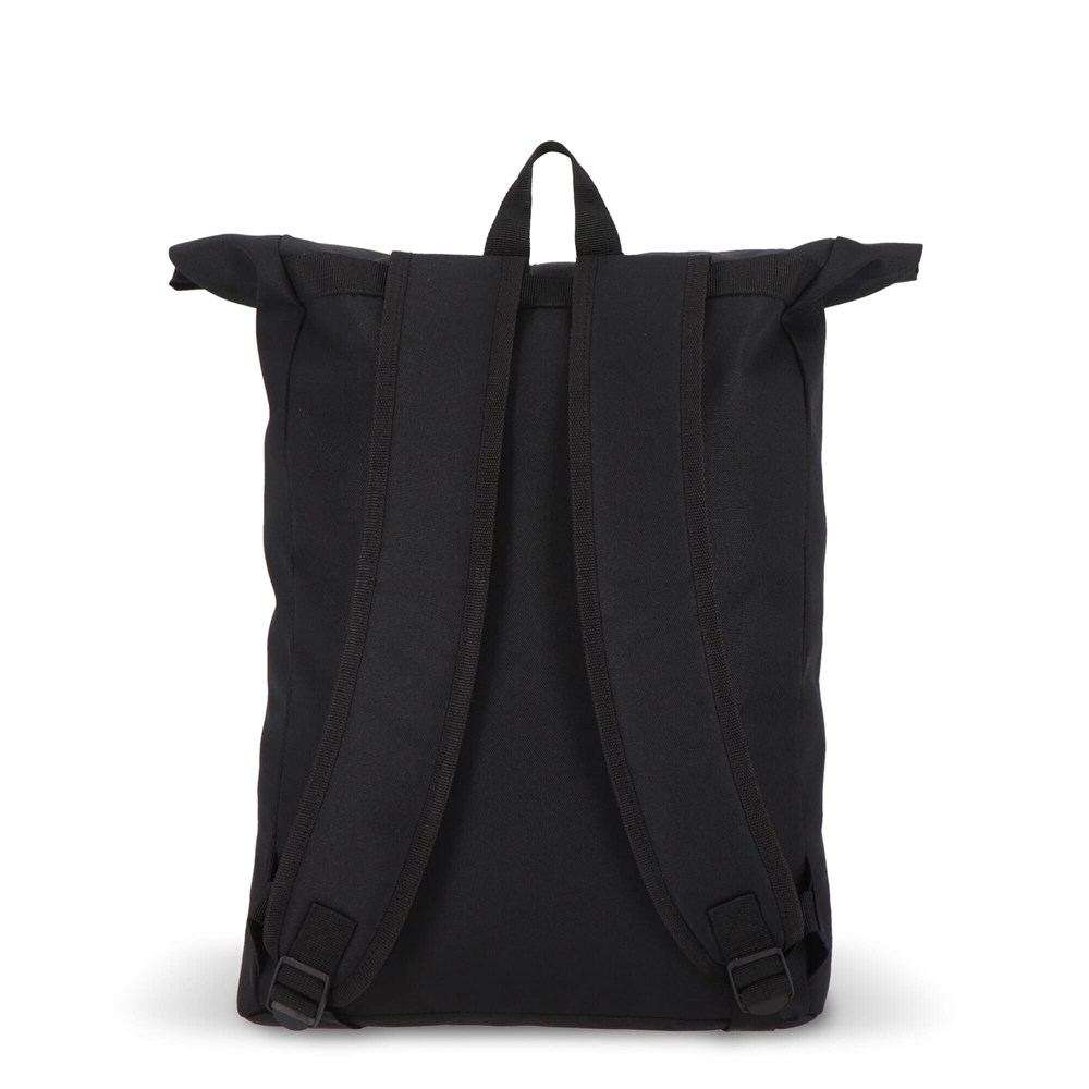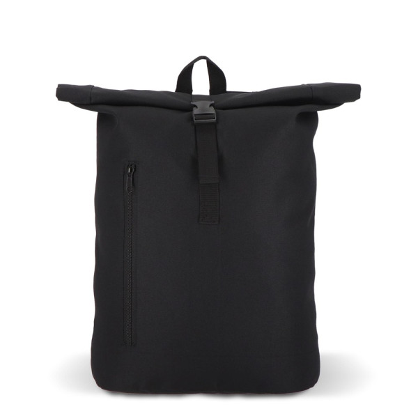 Deze handige rugzak in het trendy roll-top ontwerp is gemaakt van gerecycled PET. Hij heeft verstelbare, gewatteerde schouderbanden, een handvat aan de bovenkant en een voorvak met ritssluiting, ideaal voor kleinere accessoires.