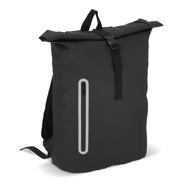 Deze rugzak met roltop is gemaakt van gerecycled PET met PU-coating in 600D-materiaal. Voorzien van reflecterende strips op de schouderbanden en rond het voorvak voor extra veiligheid in het donker. Met handvat, verstelbare gewatteerde schouderbanden en een gewatteerd laptopvak.