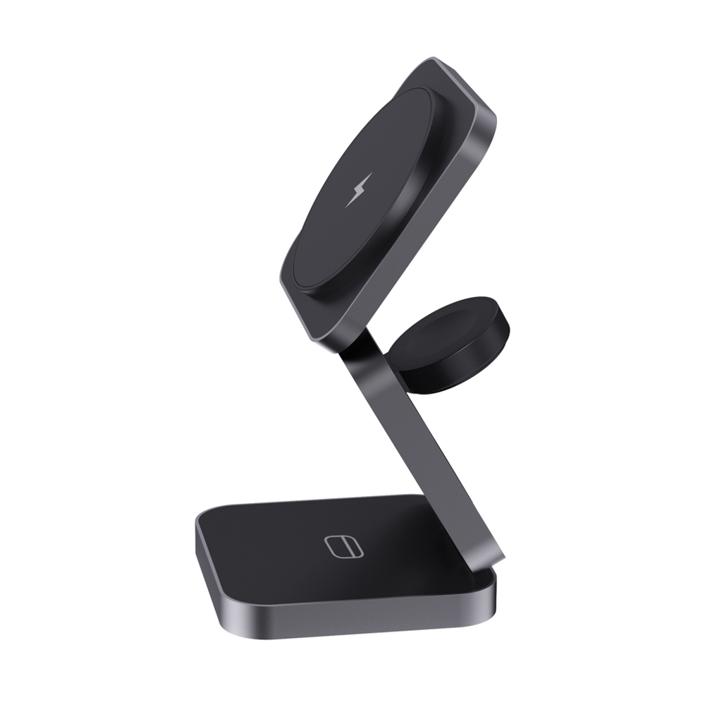 Luxe en opvouwbare 3-in-1 draadloze oplader gemaakt met RCS gerecycled ABS en RCS gerecycled aluminium. Totaal gerecycled materiaal: 46% op basis van het totale gewicht van het item. RCS-certificering zorgt voor een volledig gecertificeerde toeleveringsketen van de gerecyclede materialen. De draadloze oplader is uitgerust met een magnetische draadloze oplader van 15 W en een extra draadloze oplader van 5 W die geschikt is voor hoesjes voor oordopjes of andere kleine draadloos oplaadbare apparaten en een draadloze oplader van 2,5 W voor smartwatches (alleen Apple-horloges). Inclusief RCS-gecertificeerde 120 cm gerecyclede TPE-kabel. Verpakt in FSC® mix kraftverpakking. Artikel en accessoires 100% PVC-vrij. Ingang: 9V/3A voor optimaal gebruik. Uitgang: Telefoon: 9V/1,1A; 9V/1,67 A/(15W), Oordopjes: 5V/1A (5W), Horloge: 5V/0,5A. PVC-vrij.