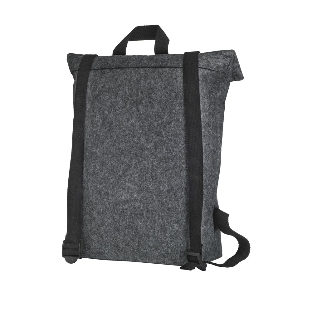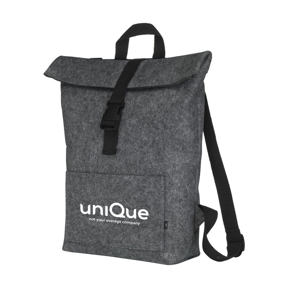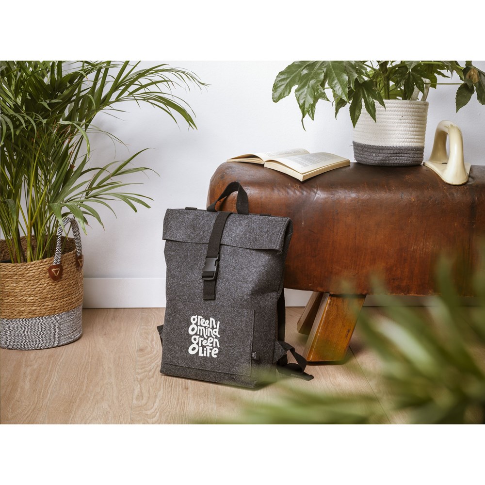 Stoere, praktische urban 'roll-top' rugzak van stevig RPET vilt. De rugzak heeft een ruim binnenvak en een insteekvak aan de voorzijde. Met draaglus en een rolsluiting met handig kliksysteem aan de bovenzijde. GRS-gecertificeerd. Totaal gerecycled materiaal: 80%. Inhoud ca. 15 liter.